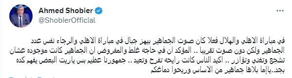 وقال أحمد شوبير، عبر حسابه بتويتر، عن جمهور الأهلي في مباراة الأهلي والرجاء: " في مباراة الاهلي والهلال فعلا كان صوت الجماهير بيهز جبال في مباراة الأهلي والرجاء نفس عدد الجماهير ولكن دون صوت تقريبا.. المؤكد إن في حاجة غلط والمفروض ان الجماهير كانت موجودة عشان تشجع وتغني وتؤازر..."