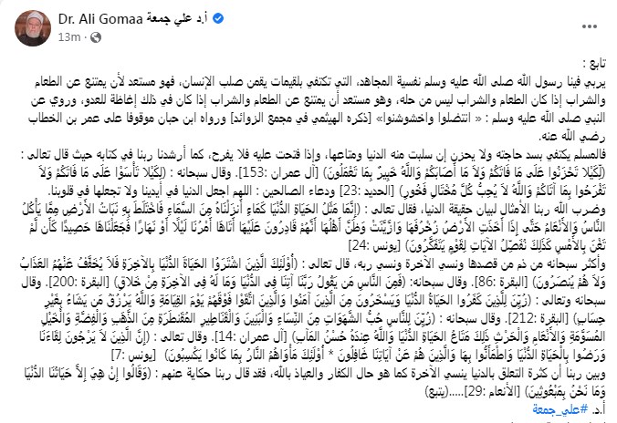 وتابع الدكتور علي جمعة فقال: "تعلمنا في شهر رمضان التقليل والتخلي عن الشهوات، والتقليل والتخلي عن الدنيا وما فيها من صفات المجاهدين في سبيل الله، وامتنعنا في نهاره عن الطعام والشراب، والنبي صلى الله عليه وسلم هو يبني المسلم وشخصيته وعقليته يقول في الحديث الذي يرويه المقدام بن معدي كرب؛ حيث قال: «ما ملأ آدمي وعاء شرا من بطنه، حسب ابن آدم ثلاث آكلات يقمن صلبه، فإن كان لا محالة فثلث طعام، وثلث شراب، وثلث لنفسه» [رواه النسائي والبيهقي في الشعب والحاكم في المستدرك].