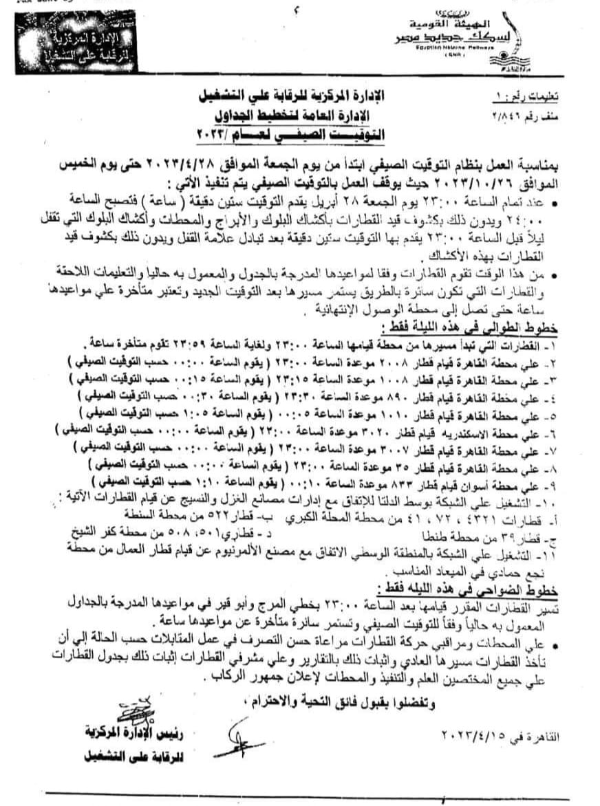 وأكدت الهيئة القومية للسكك الحديدية فى منشور رسمى لها أن القطارات سوف تلتزم بساعة تغيير فقط يوم الجمعة 28 المقبلة وهى لحظة تغيير الساعة فقط حتى لايحدث ارتباك فى المواعيد على أن تكون بذلك فى نفس مواعيدها بناء على الساعة الجديدة.
