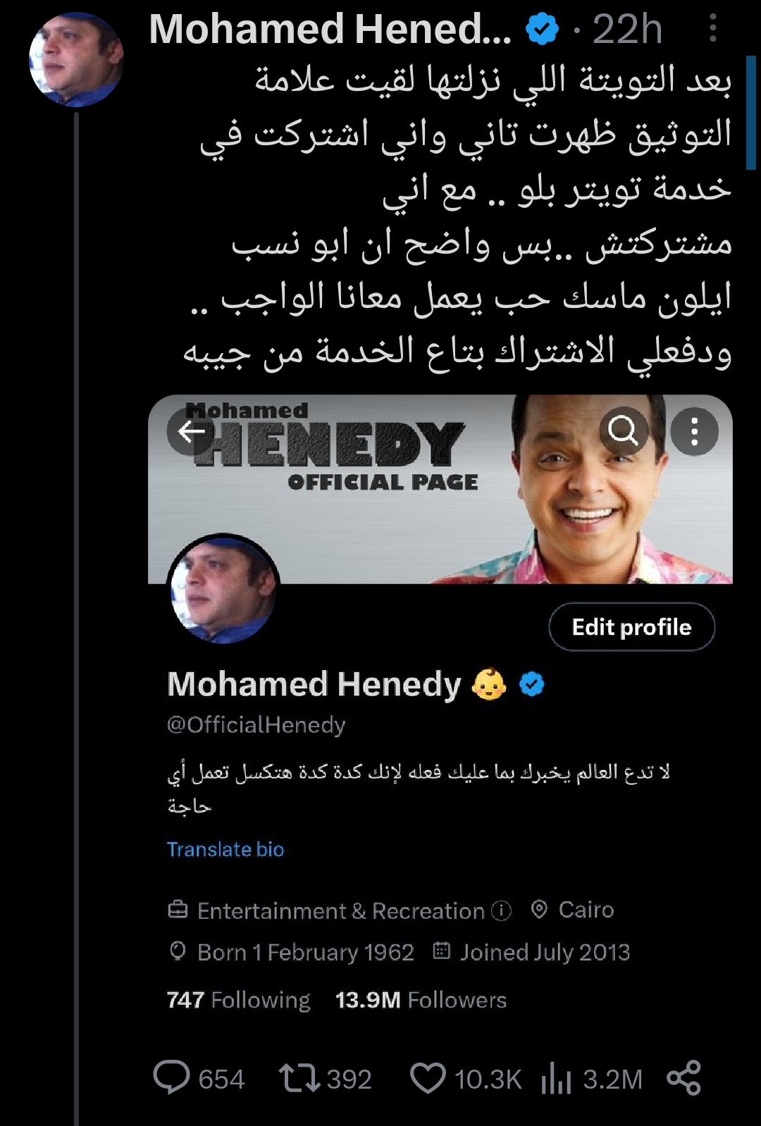 وقال الفنان محمد هنيدي بعد إعادة العلامة الزرقاء مرة أخري بجوار اسمه على موقع التواصل الاجتماعي تويتر:" بعد التويتة اللي نزلتها لقيت علامة التوثيق ظهرت تاني وإني اشتركت في خدمة تويتر بلو.. مع اني مشتركتش..بس واضح أن أبو نسب ايلون ماسك حب يعمل معانا الواجب... ود فعلي الاشتراك بتاع الخدمة من جيبه".