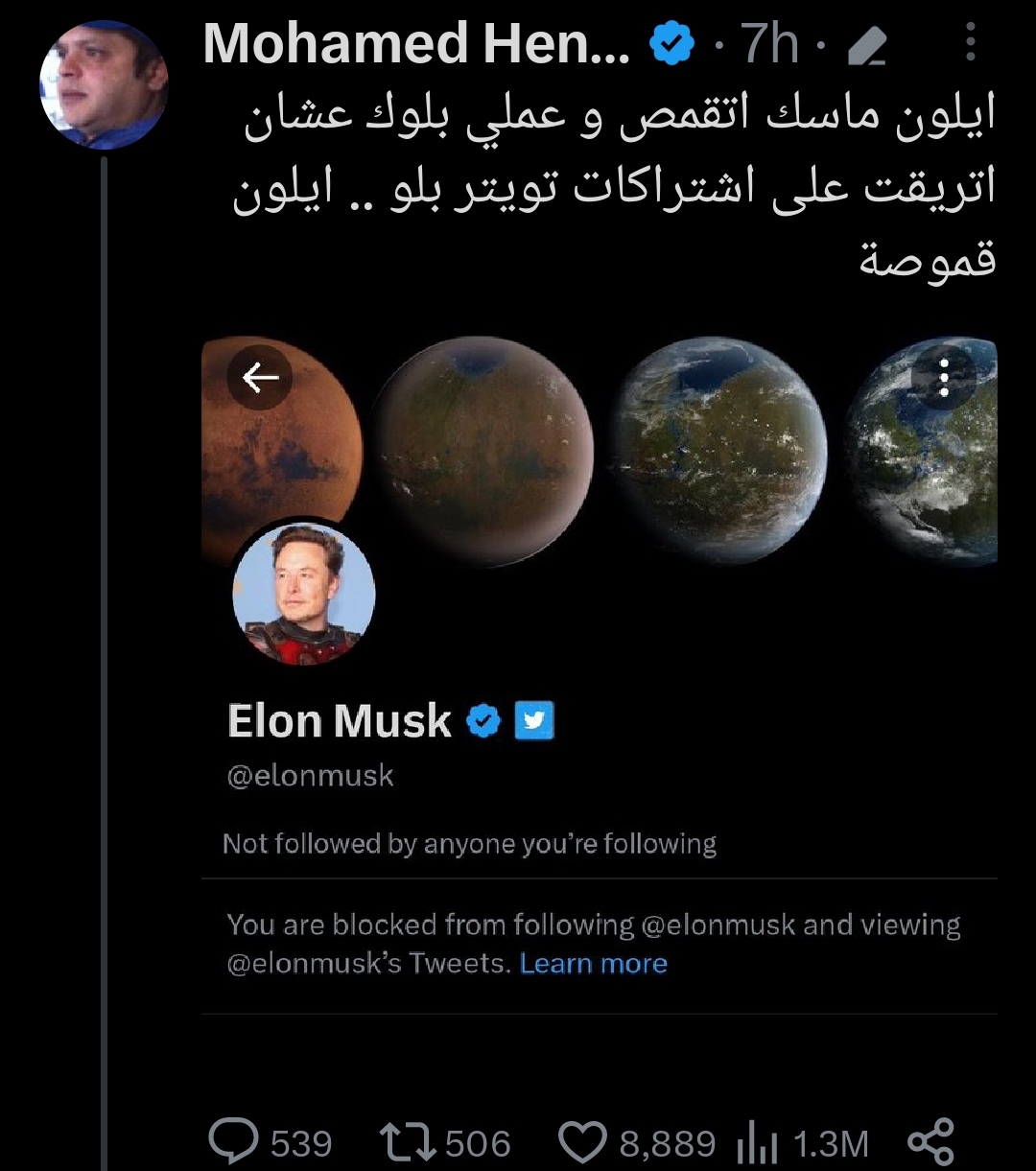 يذكر أن أيلون ماسك أزال العلامة الزرقاء من حسابات المشاهير على موقع التواصل الاجتماعي "تويتر"، ومنهم اللاعب العالمي كريستيانو رونالدو ومحمد صلاح والفنان محمد رمضان، والمطرب عمرو دياب، بالإضافة لرجل الأعمال المهندس نجيب ساويرس.