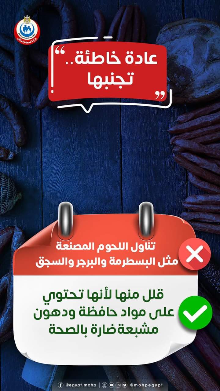 نصحت وزارة الصحة بضرورة التقليل من تناول اللحوم المصنعة مثل البسطرمة والبرجر والسجق، لأنه مليء بالمواد الحافظة والدهون المضرة بالصحة لأنها من العادات الخاطئة.