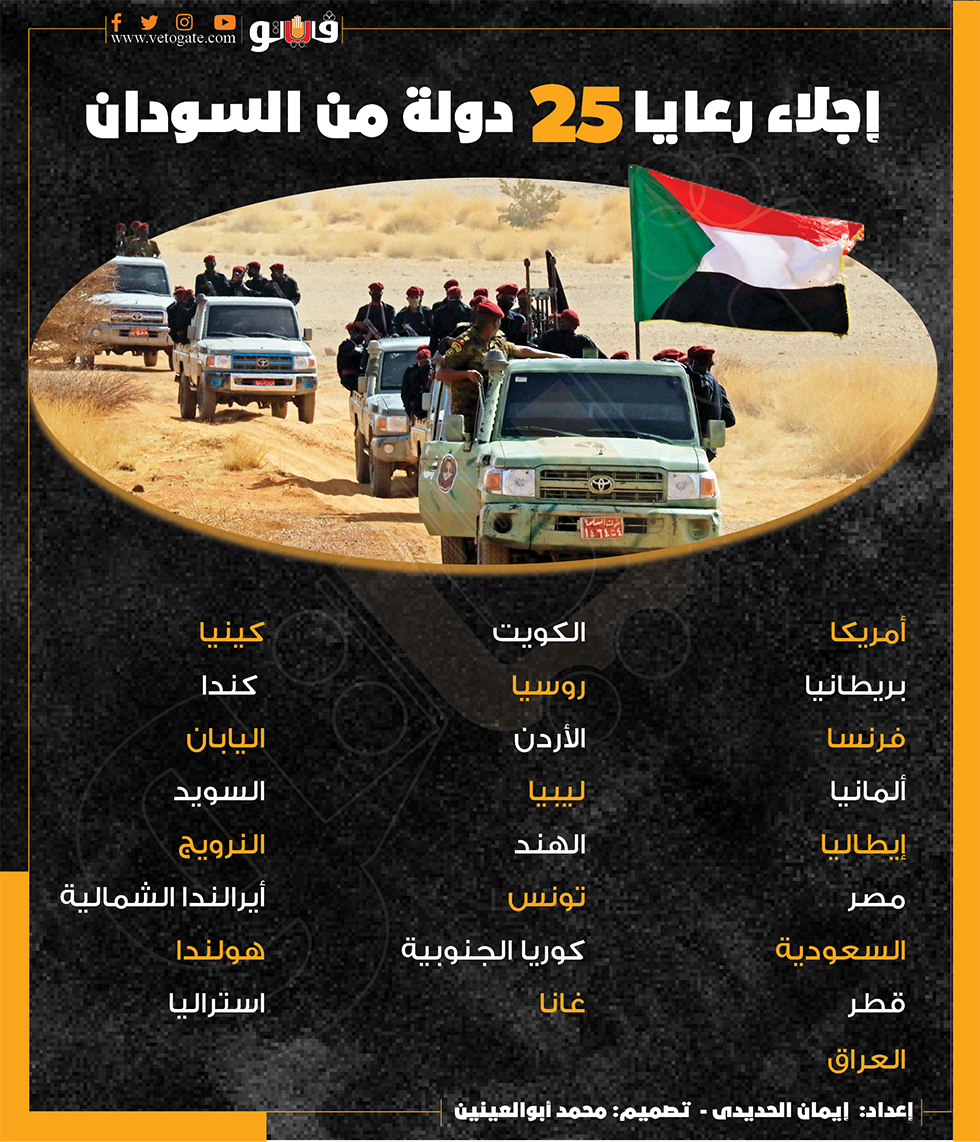 إجلاء رعايا 25 دولة من السودان (انفوجراف) الإثنين 24/أبريل/2023 - 02:05 م 4/24/2023 2:05:32 PM إجلاء رعايا 25 دولة من السودان، فيتو إيمان الحديدى شارك طباعة 18 حجم الخط شارك طباعة إجلاء من السودان السودان كوريا الجنوبية روسيا