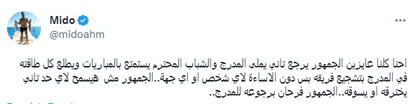 وكتب أحمد حسام "ميدو"، تغيردة عبر تويتر، عن عودة الجمهور للمدرجات "احنا كلنا عايزين الجمهور يرجع تاني يملى المدرج والشباب المحترم يستمتع بالمباريات ويطلع كل طاقته في المدرج بتشجيع فريقه بس دون الاساءة لاي شخص او اي جهة.."