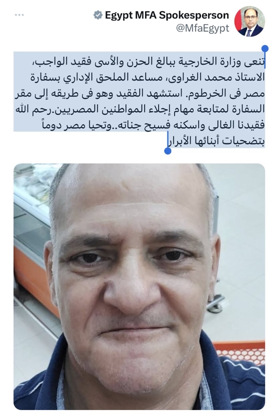 وقالت الخارجية في بيان: "تنعى وزارة الخارجية وأعضاؤها ببالغ الحزن والأسىشهيد الواجب محمد الغراوي مساعد الملحق الإداري بسفارة جمهورية مصر العربية في الخرطوم، الذى استشهد اليوم الإثنين ٢٤ إبريل الجارى خلال توجهه من منزله إلىمقر السفارة لمتابعة إجراءات الإجلاء الخاصة بالمواطنين المصريين فى السودان".