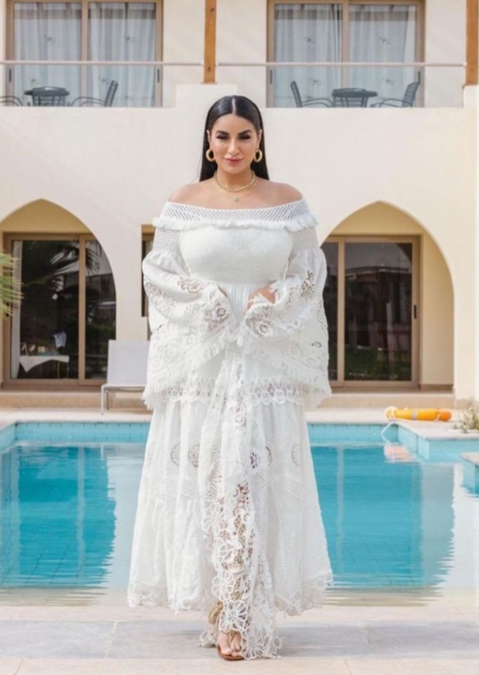 وحرصت جوري بكر على ارتداء فستان أبيض دانتيل طويل بسيط مع شعر منسدل طويل.