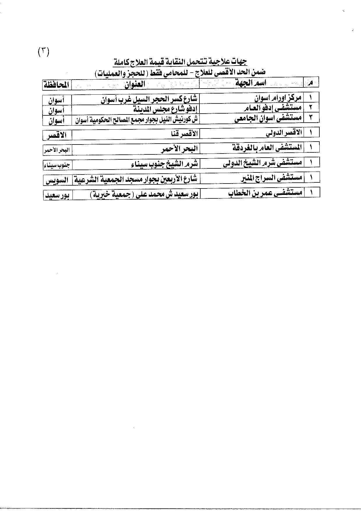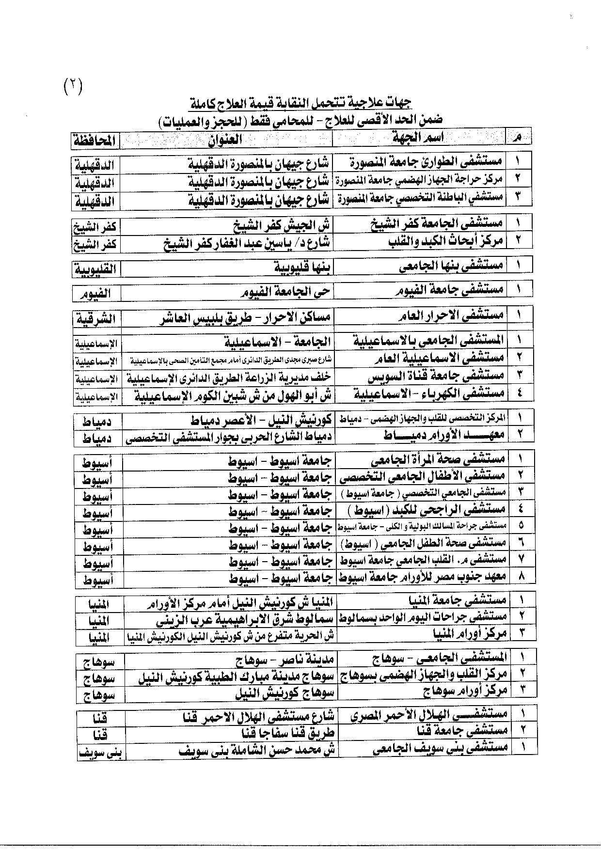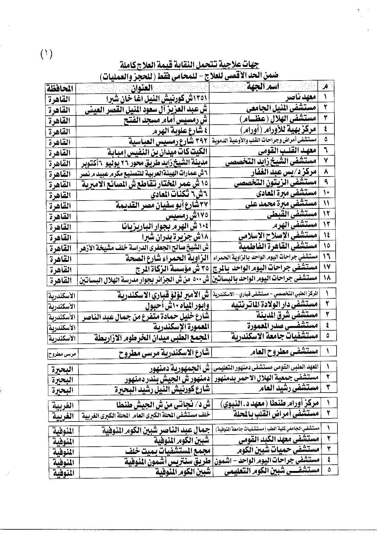 أولًا: تتحمل النقابة العامة كامل تكلفة علاج المحامي في المستشفيات الحكومية والتعليمية والجامعية المبينة بالجدول الذي سيتم إرفاقه بهذا القرار .