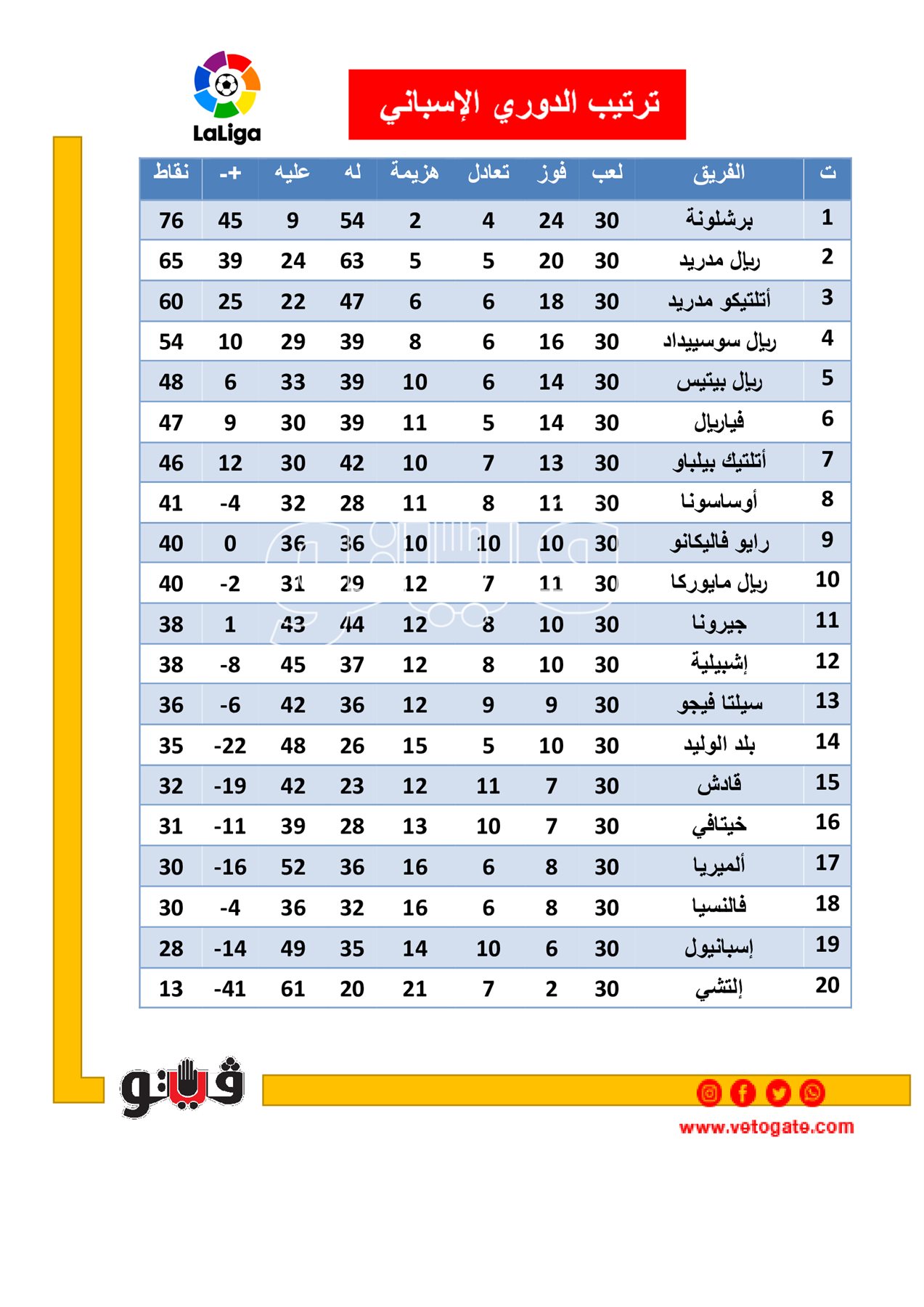 ترتيب الدوري الإسباني، تنشر فيتو ترتيب الدوري الاسباني لكرة القدم، بعد انتهاء الجولة الـ30 لمسابقة الليجا والتي يتصدرها برشلونة