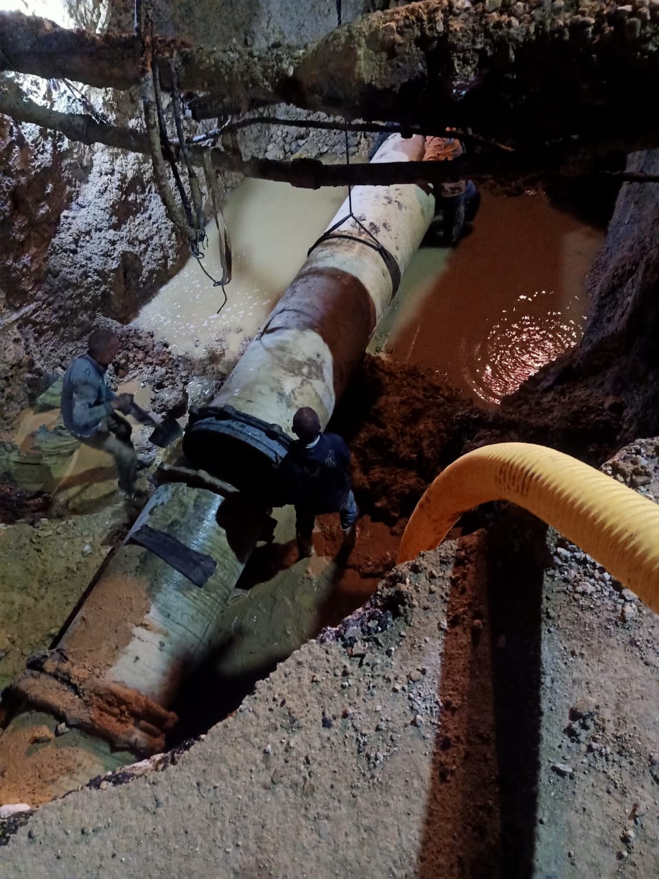 تابع اللواء عبد الحميد عصمت رئيس مجلس الإدارة والعضو المنتدب لشركة مياه الشرب والصرف الصحي بمحافظات القناة، أعمال إصلاح كسر بخط طرد محطة رفع صرف صحى الجبلايات 800مم GRP بحى الجناين بالسويس.