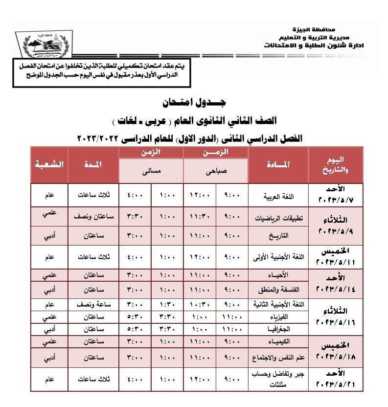 جدول امتحانات نهاية العام للصفين الأول والثاني الثانوي بالجيزة