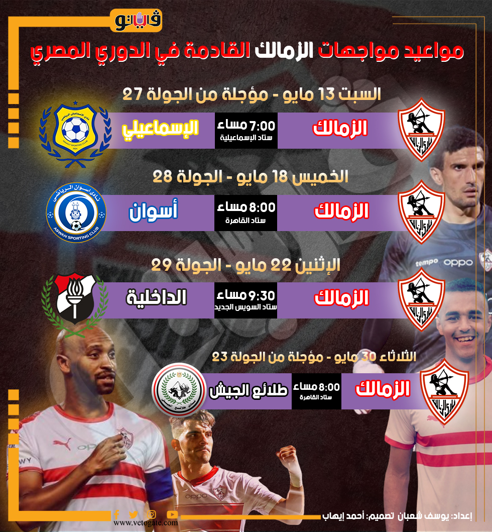 مواعيد مواجهات الزمالك القادمة في الدوري المصري (إنفوجراف)