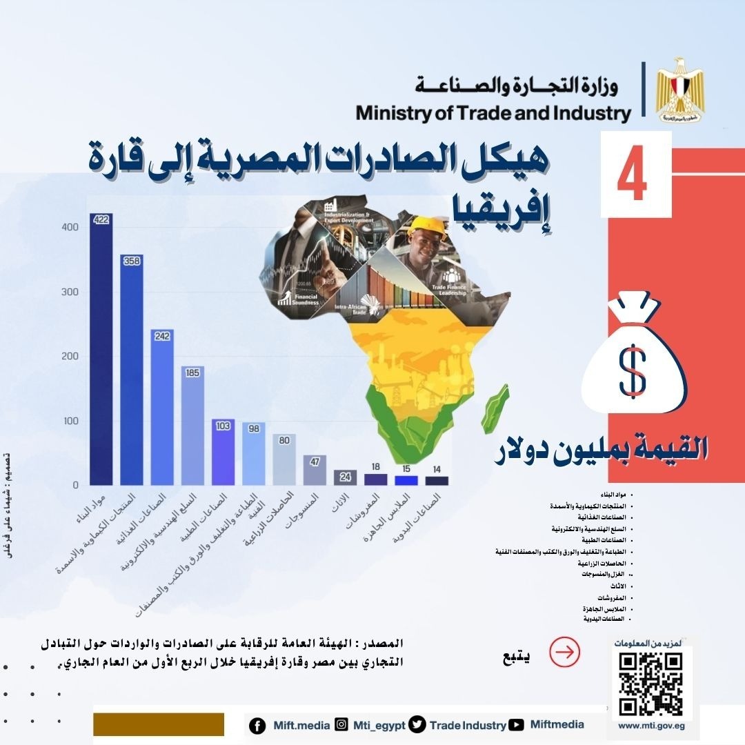 وأضاف النجار أن أبرز القطاعات التي شكلت هيكل الصادرات المصرية إلى قارة إفريقيا خلال الربع الأول من العام الجاري تضمنت مواد البناء بقيمة 422 مليون دولار، والمنتجات الكيماوية والاسمدة بقيمة 358 مليون دولار، والصناعات الغذائية بقيمة 242 مليون دولار، والسلع الهندسية والالكترونية بقيمة 185 مليون دولار، والصناعات الطبية بقيمة 103 مليون دولار، والطباعة والتغليف والورق والكتب والمصنفات الفنية بقيمة 98 مليون دولار، والحاصلات الزراعية بقيمة 80 مليون دولار، والغزل والمنسوجات بقيمة 47 مليون دولار، والاثاث بقيمة 24 مليون دولار، والمفروشات بقيمة 18 مليون دولار، والملابس الجاهزة بقيمة 15 مليون دولار، والصناعات اليدوية بقيمة 14 مليون دولار.