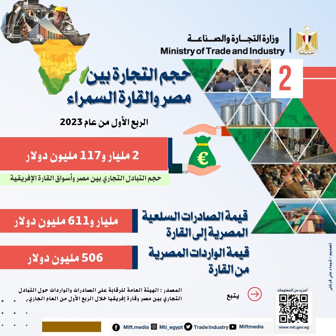 أعلن المهندس أحمد سمير وزير التجارة والصناعة أن حجم التبادل التجاري بين مصر وأسواق القارة الإفريقية بلغ نحو 2 مليار و117 مليون دولار خلال الربع الأول من العام الجاري، لافتًا إلى أن قيمة الصادرات السلعية المصرية إلى القارة بلغت مليار و611 مليون دولار كما بلغت قيمة الواردات المصرية من القارة 506 ملايين دولار.
