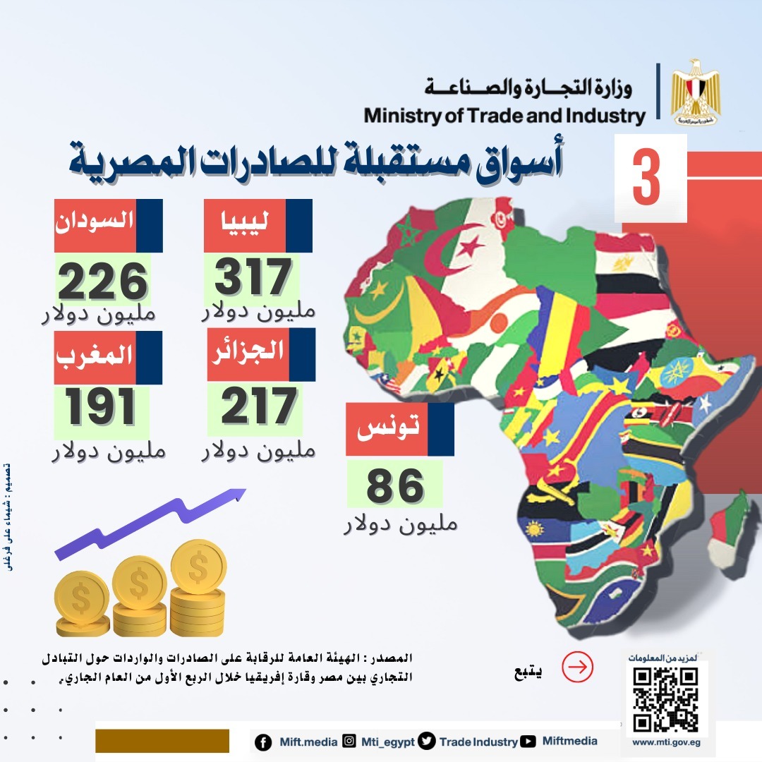 ومن جانبه أوضح اللواء عصام النجار، رئيس الهيئة العامة للرقابة على الصادرات والواردات أن أكبر 5 أسواق مستقبلة للصادرات المصرية شملت ليبيا بقيمة 317 مليون دولار والسودان بقيمة 226 مليون دولار والجزائر بقيمة 217 مليون دولار والمغرب بقيمة 191 مليون دولار وتونس بقيمة 86 مليون دولار.