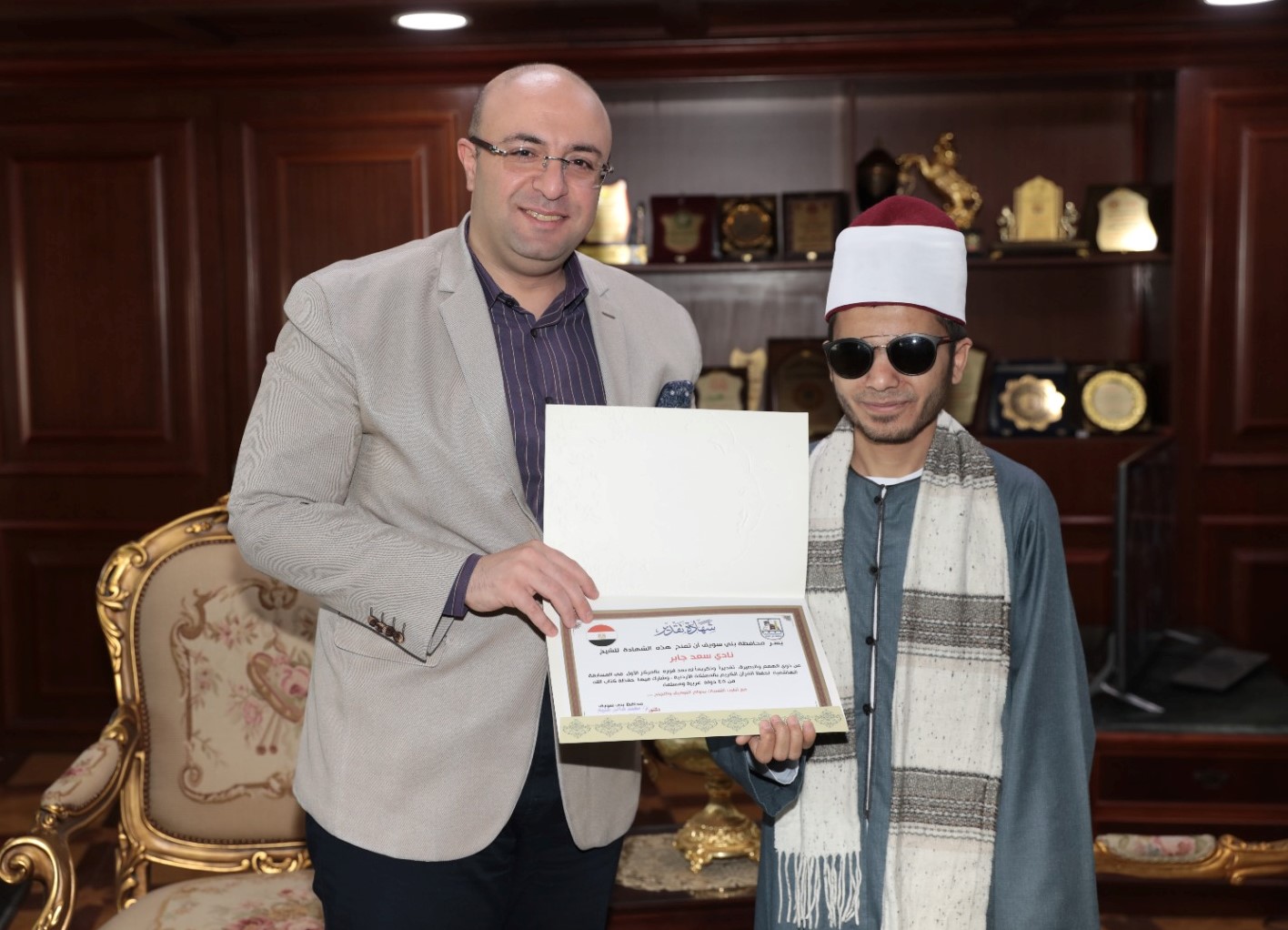 كرم الدكتور محمد هاني غنيم محافظ بني سويف، اليوم الخميس، الشيخ "نادي سعد جابر" من ذوي الهمم، الفائز بالمركز الأول في المسابقة الهاشمية العالمية لحفظ القرآن الكريمة، والتي نظمتها المملكة الأردنية الشقيقة، وشارك فيها متسابقون من أكثر من 40 دولة عربية وإسلامية.