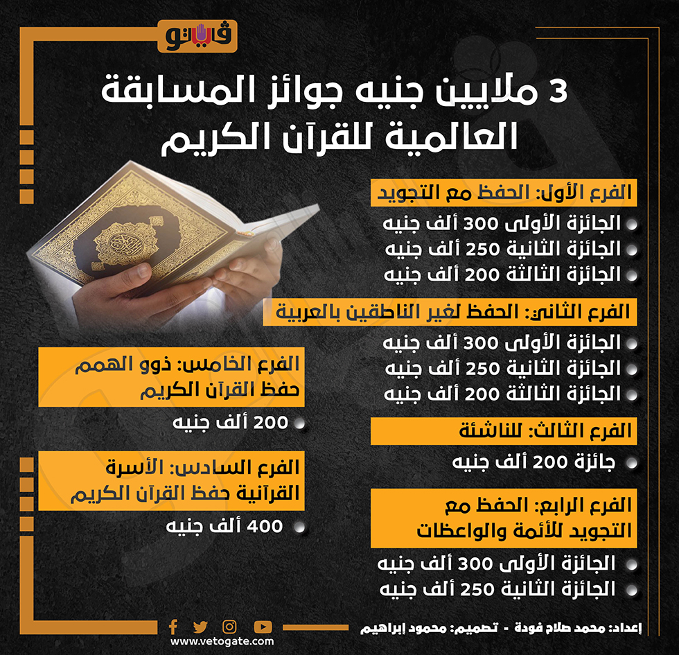 3 ملايين جنيه جوائز المسابقة العالمية للقرآن الكريم (إنفوجراف) السبت 29/أبريل/2023 - 11:26 ص 4/29/2023 11:26:22 AM المسابقة العالمية لحفظ القرآن الكريم - محمد صلاح فودة شارك طباعة 18 حجم الخط شارك طباعة المسابقة العالمية للقرآن المسابقة العالمية للقرآن الكريم جوائز المسابقة العالمية للقران الكريم حفظ القران الكريم