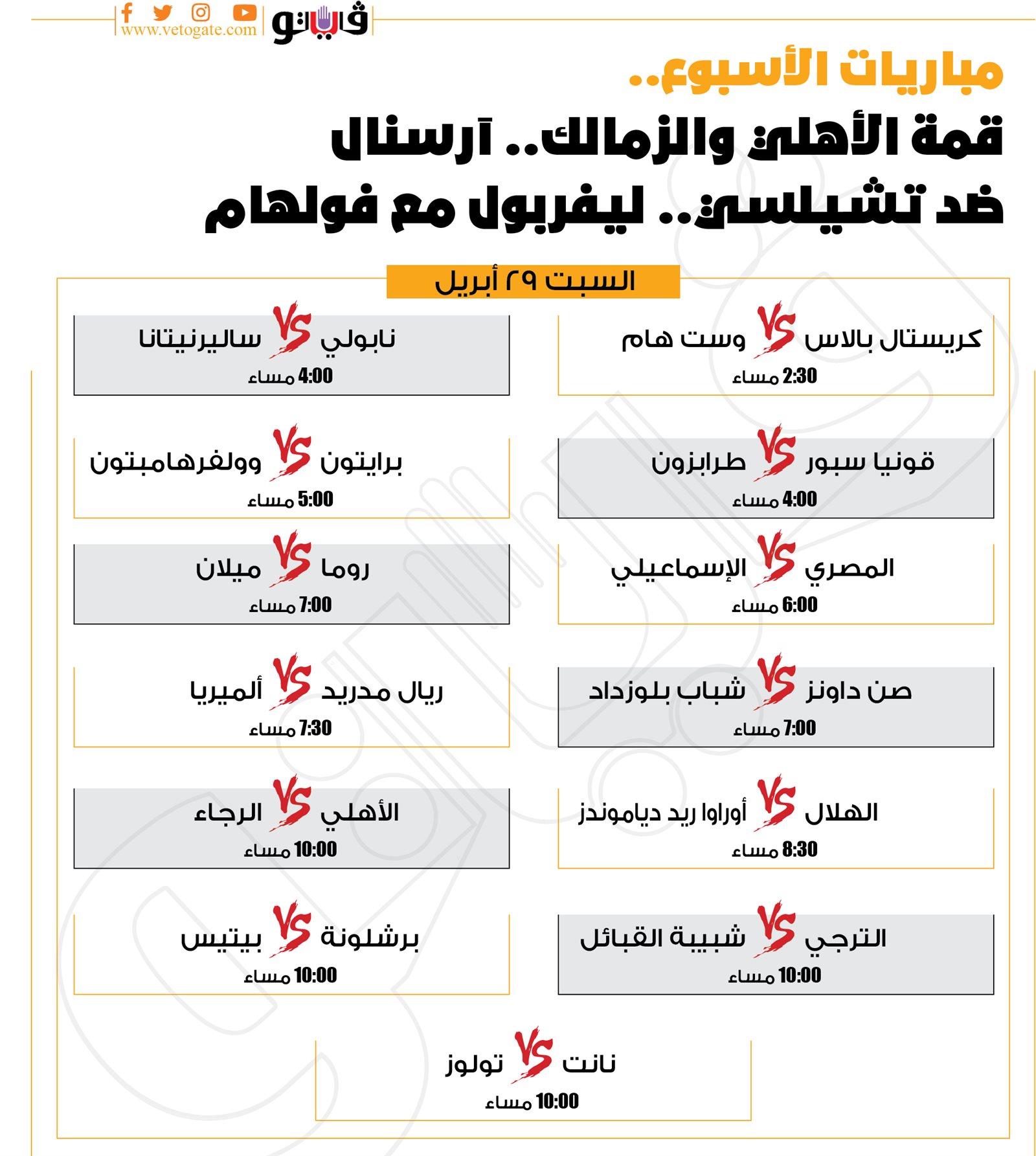 مباريات الأسبوع، قمة الأهلي والزمالك.. آرسنال ضد تشيلسي.. ليفربول مع فولهام (إنفوجراف) الجمعة 28/أبريل/2023 - 06:48 م 4/28/2023 6:48:31 PM الأهلي والزمالك، فيتو محمد سيد شارك طباعة 18 حجم الخط شارك طباعة الأهلي الزمالك ليفربول تشيلسي أرسنال مانشستر يونايتد مانشستر سيتي