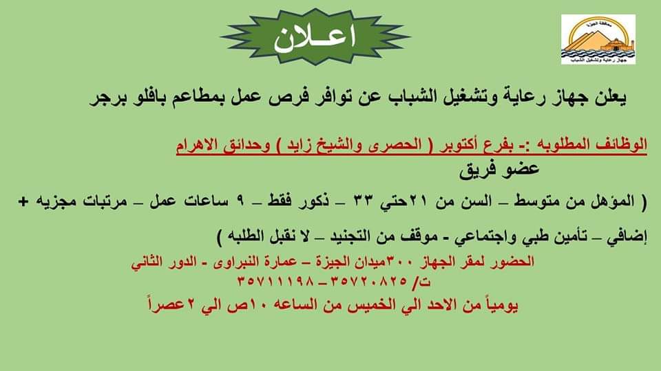 أعلن جهاز تشغيل الشباب بمحافظة الجيزة عن توافر فرص عمل للشباب بمطعم بافلو برجر.