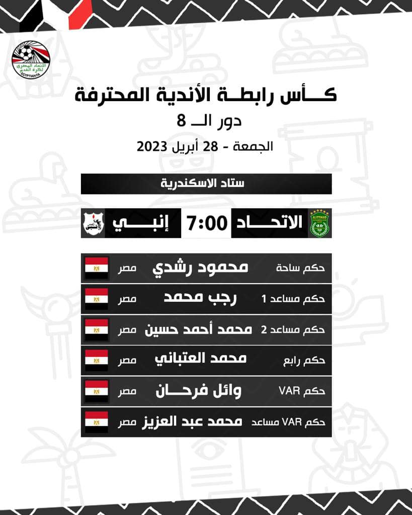 كأس الرابطة، الإعلان عن حكام مباراة الاتحاد السكندري وإنبي بربع النهائي