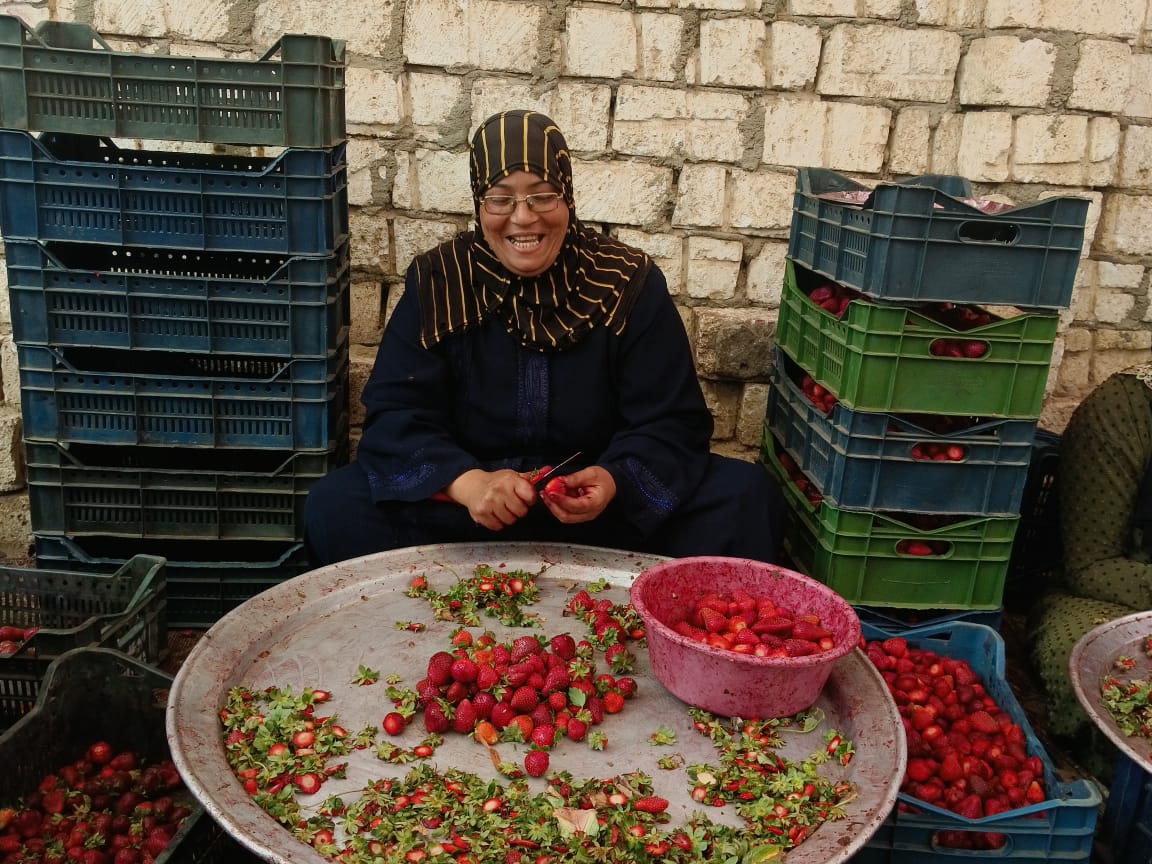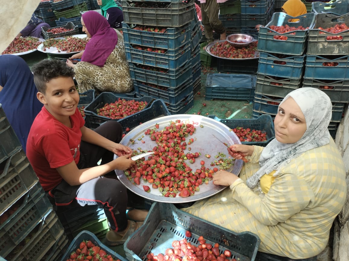 12 ساعة يوميًا مدة عمل السيدات في مفرش الفراولة حسبما توكد أحلام إسماعيل إحدى القائمات على تقميع الفراولة، حيث يقمن بإزالة الزهرة من ثمرة الفراولة ووضعها في برانيك بلاستيكية، ثم ينتهي العمل في العاشرة مساءً بعد نفاد الكمية المقرر تجهيزها وتقميعها.