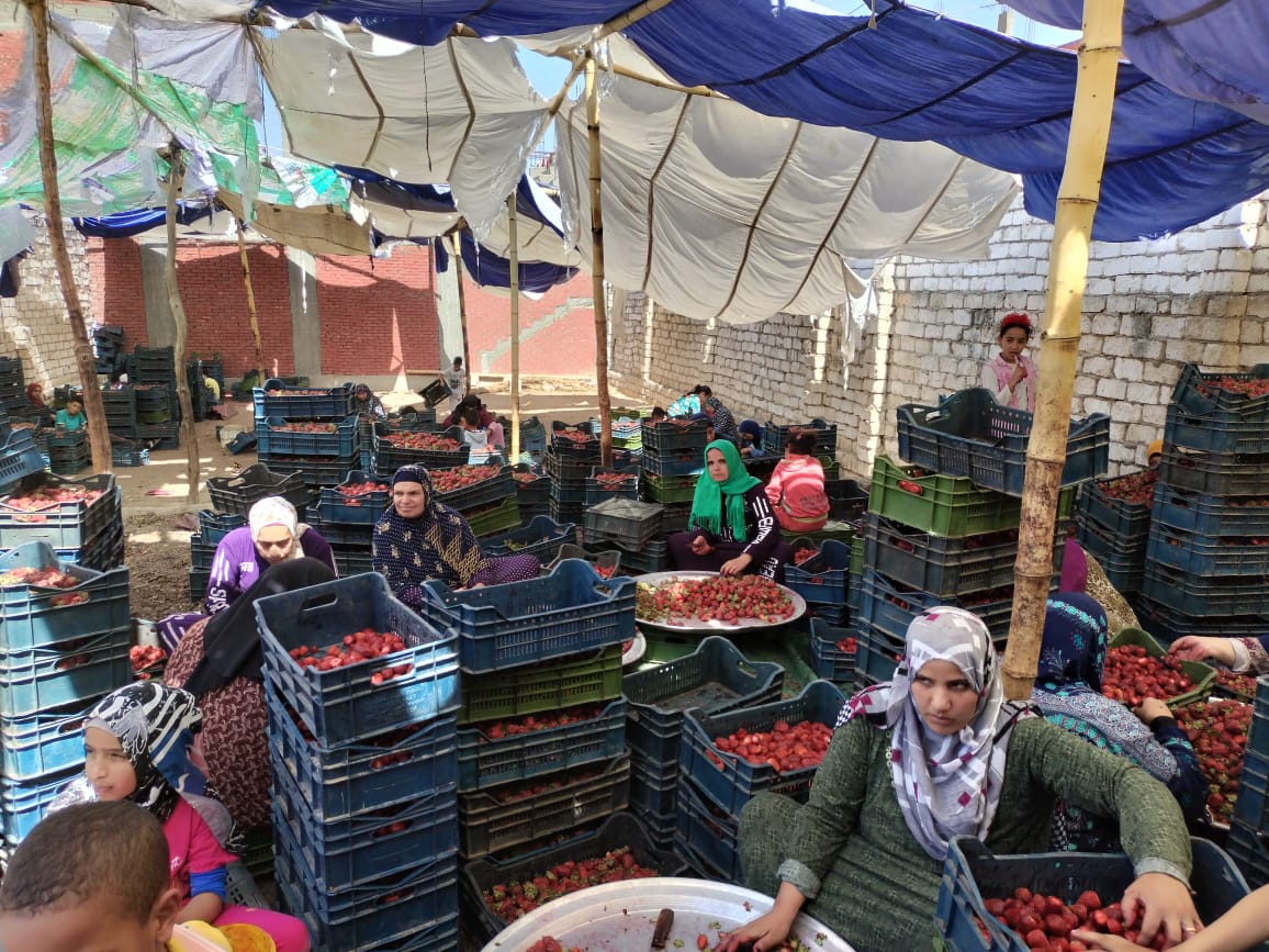 "تقميع الفراولة".. مهنة سيدات منطقة التجارة التابعة لكفر داود بمركز السادات، حيث يعملن بها طيلة 5 أشهر ثم يقمن بالعمل في تجهيز المشمش والبصل للتوريد للمصانع عقب انتهاء موسم الفراولة.