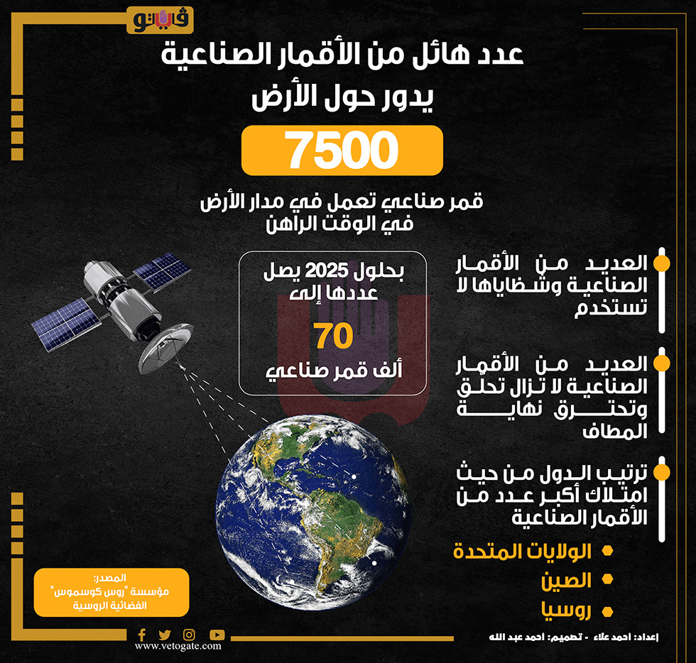 عدد هائل من الأقمار الصناعية يدور حول الأرض (انفوجراف) الأحد 30/أبريل/2023 - 06:53 م 4/30/2023 6:53:15 PM الأقمار الصناعية، فيتو احمد علاء شارك طباعة 18 حجم الخط شارك طباعة الأقمار الصناعية قمر صناعي الأرض أمريكا الصين روسيا