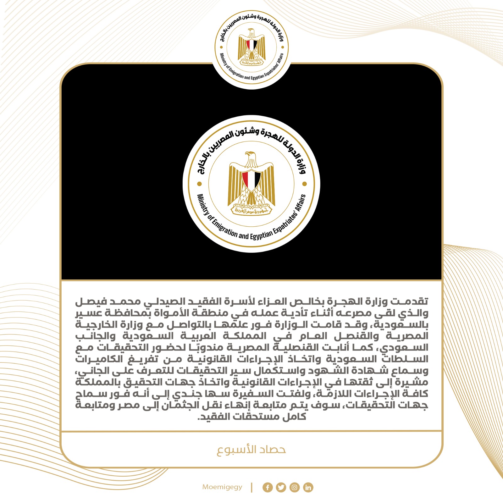وتقدمت وزارة الهجرة بخالص العزاء لأسرة الفقيد الصيدلي محمد فيصل والذي لقى مصرعه أثناء تأدية عمله في منطقة الأمواة بمحافظة عسير بالسعودية، وقد قامت الوزارة فور علمها بالتواصل مع وزارة الخارجية المصرية والقنصل العام في المملكة العربية السعودية والجانب السعودي، كما أنابت القنصلية المصرية مندوبًا لحضور التحقيقات مع السلطات السعودية واتخاذ الإجراءات القانونية من تفريغ الكاميرات وسماع شهادة الشهود واستكمال سير التحقيقات للتعرف على الجاني، مشيرة إلى ثقتها في الإجراءات القانونية واتخاذ جهات التحقيق بالمملكة كافة الإجراءات اللازمة، ولفتت السفيرة سها جندي إلى أنه فور سماح جهات التحقيقات، سوف يتم متابعة إنهاء نقل الجثمان إلى مصر ومتابعة كامل مستحقات الفقيد.