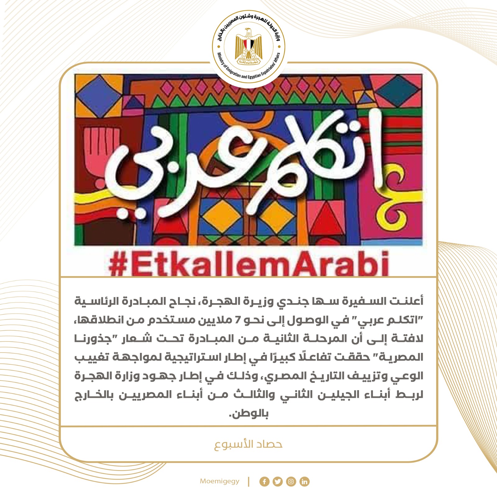 وأعلنت السفيرة سها جندي وزيرة الهجرة، نجاح المبادرة الرئاسية "اتكلم عربي" في الوصول إلى نحو 7 ملايين مستخدم من انطلاقها، لافتة إلى أن المرحلة الثانية من المبادرة تحت شعار "جذورنا المصرية" حققت تفاعلًا كبيرًا في إطار استراتيجية لمواجهة تغييب الوعي وتزييف التاريخ المصري، وذلك في إطار جهود وزارة الهجرة لربط أبناء الجيلين الثاني والثالث من أبناء المصريين بالخارج بالوطن.