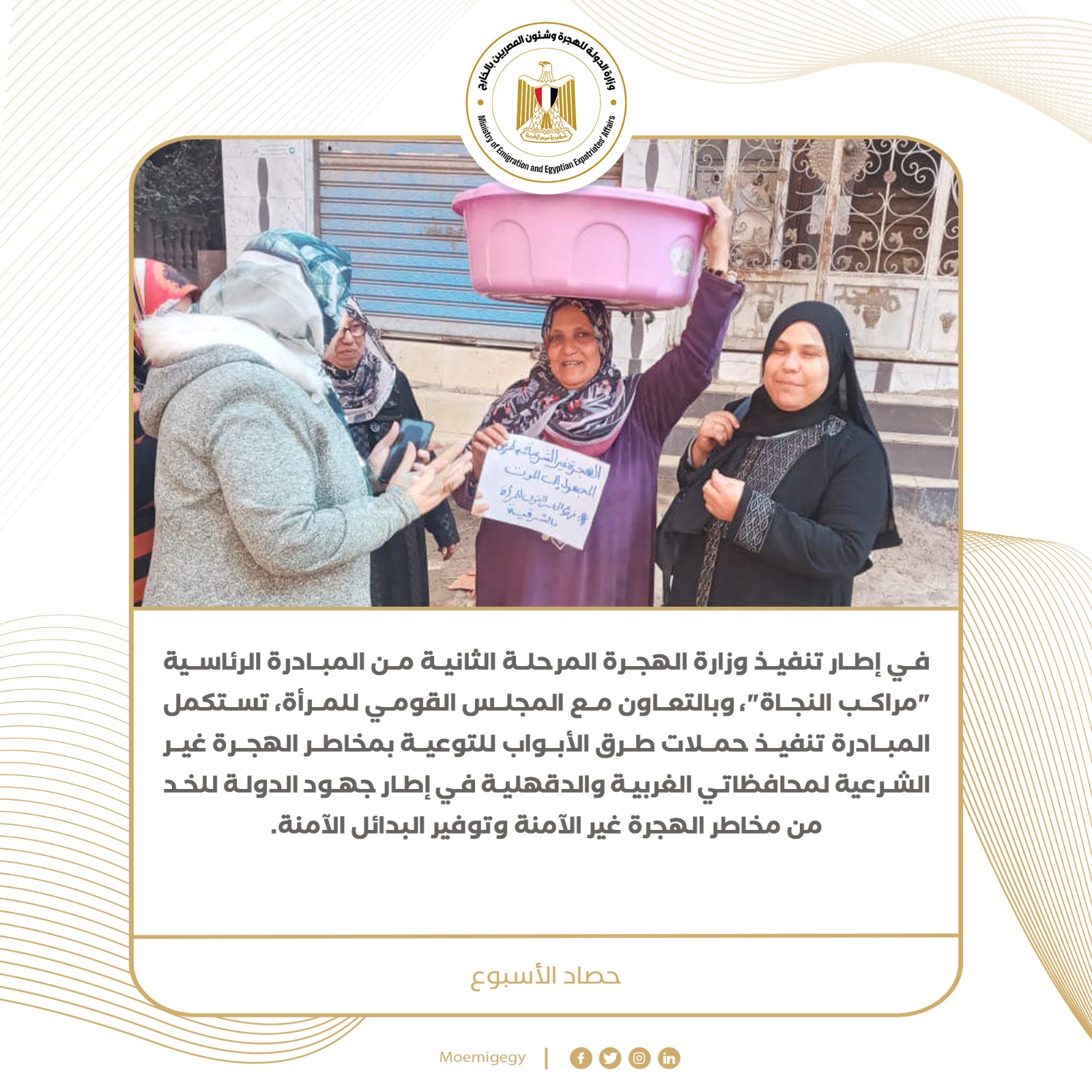 في إطار تنفيذ وزارة الهجرة المرحلة الثانية من المبادرة الرئاسية "مراكب النجاة"، وبالتعاون مع المجلس القومي للمرأة، تستكمل المبادرة تنفيذ حملات طرق الأبواب للتوعية بمخاطر الهجرة غير الشرعية لمحافظاتي الغربية والدقهلية في إطار جهود الدولة للخد من مخاطر الهجرة غير الآمنة وتوفير البدائل الآمنة. وأعربت السفيرة سها جندي وزيرة الهجرة عن أهمية تنفيذ حملات طرق الأبواب، في إطار تنفيذ المبادرة، مؤكدة على الدور الإيجابي لتلك الحملات في الوصول لشرائح متعددة من المرأة المصرية في القرى المصدرة للهجرة غير الشرعية، ومشيرة للتأثير الكبير لحملات طرق الأبواب التي تنفذها الوزارة بالتعاون مع المجلس القومي للمرأة، حيث إن المرأة على رأس الفئات المستهدفة لكونها صاحبة التأثير في قرار أبنائها نحو الهجرة غير الشرعية أو العكس.
