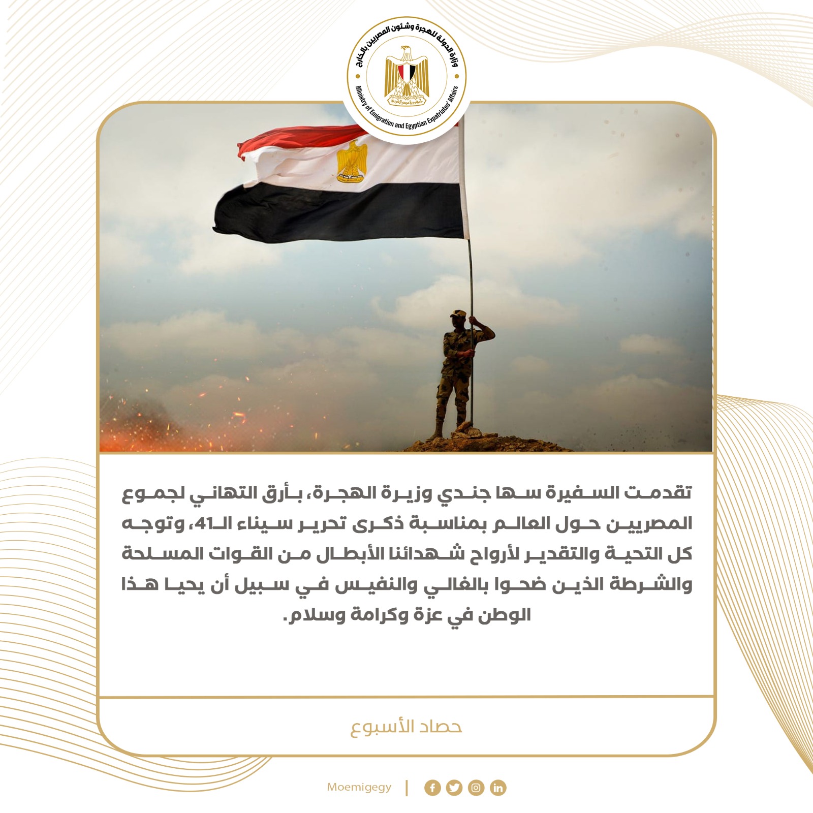 و تقدمت السفيرة سها جندي وزيرة الهجرة، بأرق التهاني لجموع المصريين حول العالم بمناسبة ذكرى تحرير سيناء الـ41، وتوجه كل التحية والتقدير لأرواح شهدائنا الأبطال من القوات المسلحة والشرطة الذين ضحوا بالغالي والنفيس في سبيل أن يحيا هذا الوطن في عزة وكرامة وسلام.