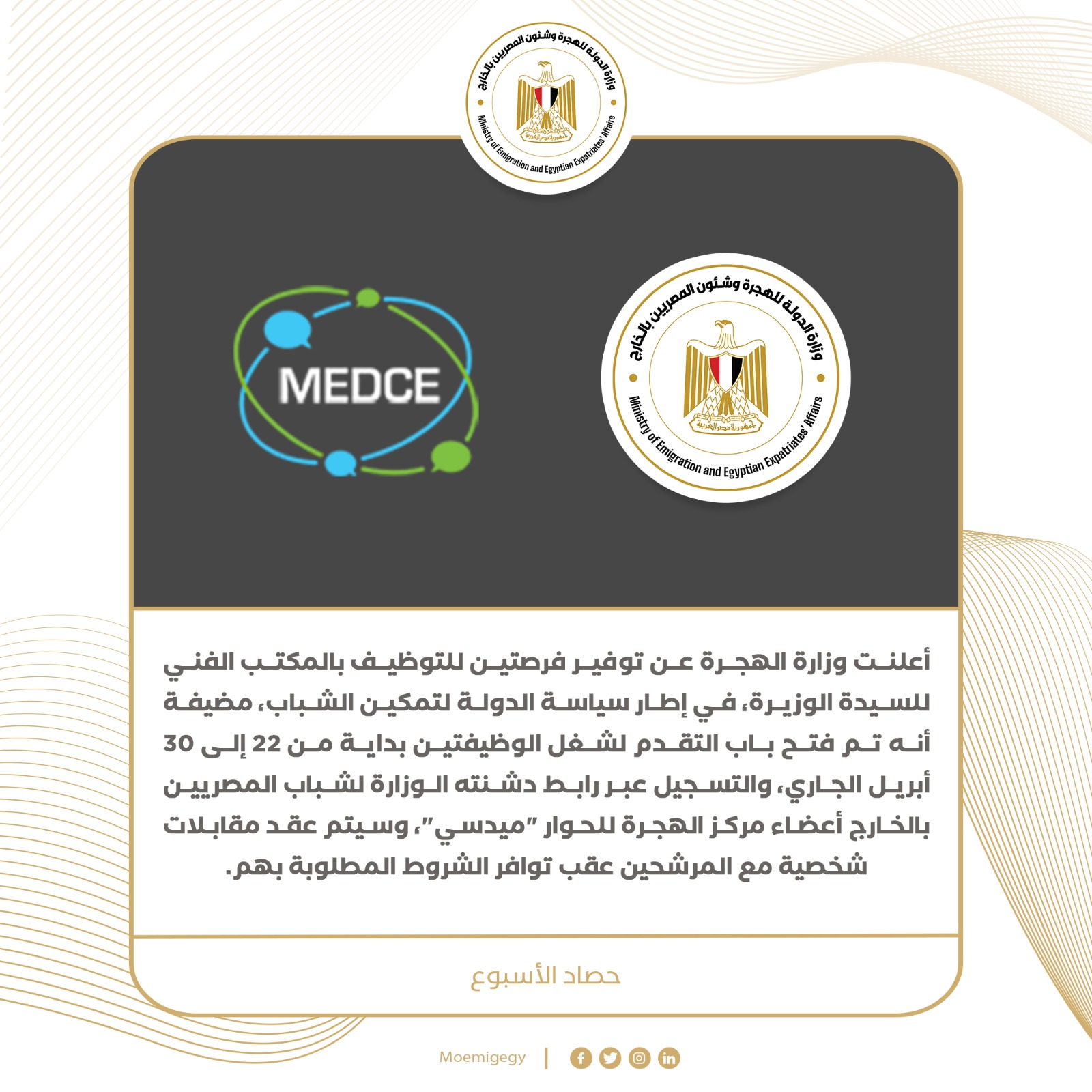 واعلنت وزارة الهجرة عن توفير فرصتين للتوظيف بالمكتب الفني للسيدة الوزيرة، في إطار سياسة الدولة لتمكين الشباب، مضيفة أنه تم فتح باب التقدم لشغل الوظيفتين بداية من 22 إلى 30 أبريل الجاري، والتسجيل عبر رابط دشنته الوزارة لشباب المصريين بالخارج أعضاء مركز الهجرة للحوار "ميدسي"، وسيتم عقد مقابلات شخصية مع المرشحين عقب توافر الشروط المطلوبة بهم.