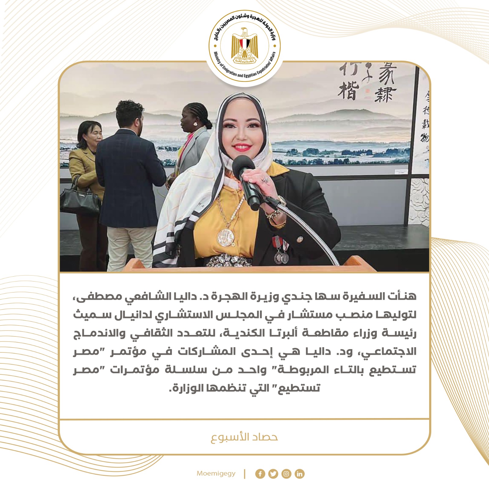 و هنأت السفيرة سها جندي وزيرة الهجرة د. داليا الشافعي مصطفى، لتوليها منصب مستشار في المجلس الاستشاري لدانيال سميث رئيسة وزراء مقاطعة ألبرتا الكندية، للتعدد الثقافي والاندماج الاجتماعي، ود. داليا هي إحدى المشاركات في مؤتمر "مصر تستطيع بالتاء المربوطة" واحد من سلسلة مؤتمرات "مصر تستطيع" التي تنظمها الوزارة.