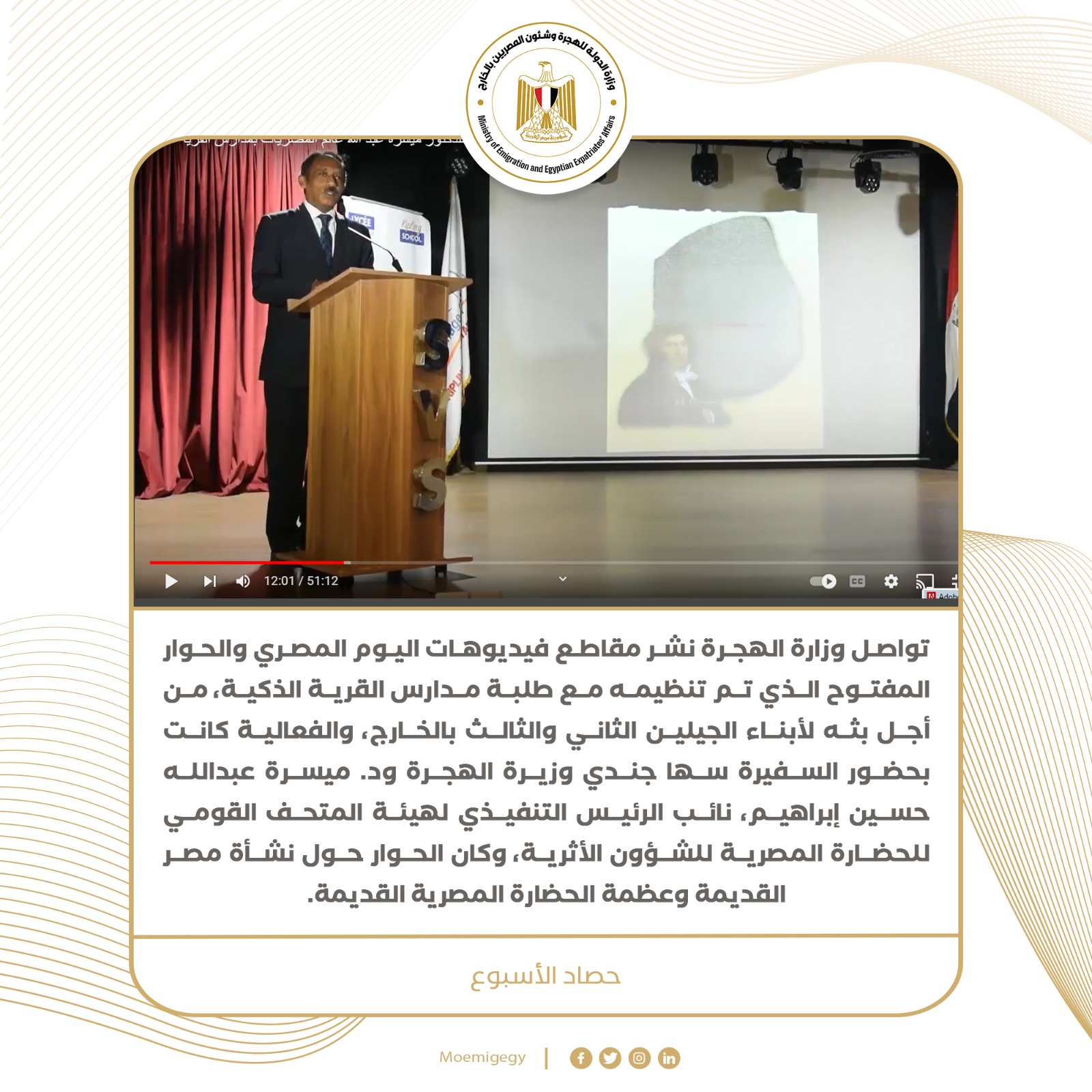 وتواصل وزارة الهجرة نشر مقاطع فيديوهات اليوم المصري والحوار المفتوح الذي تم تنظيمه مع طلبة مدارس القرية الذكية، من أجل بثه لأبناء الجيلين الثاني والثالث بالخارج، والفعالية كانت بحضور السفيرة سها جندي وزيرة الهجرة ود. ميسرة عبدالله حسين إبراهيم، نائب الرئيس التنفيذي لهيئة المتحف القومي للحضارة المصرية للشؤون الأثرية، وكان الحوار حول نشأة مصر القديمة وعظمة الحضارة المصرية القديمة.