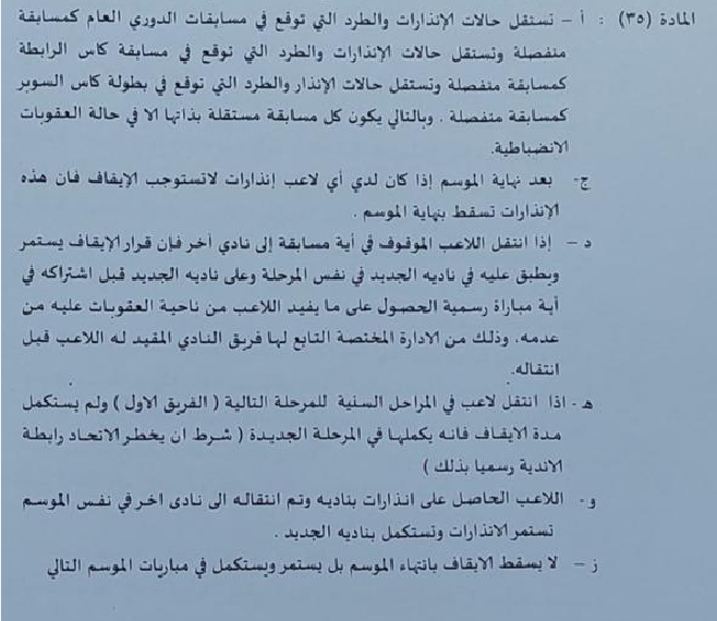 وحصلت فيتو على لائحة رابطة الأندية المنظمة للمسابقات المحلية، وجاء في البند 35 الفقرة أ، من اللائحة أنه “تستقل حالات الإنذارات والطرد التي توقع في مسابقات الدوري العام كمسابقة منفصلة وتستقل حالات الإنذارات والطرد التي توقع في مسابقة كأس الرابطة كمسابقة منفصلة، وتستقل حالات الإنذارات والطرد التي توقع في بطولة كأس السوبر كمسابقة منفصلة.. وبالتالي يكون كل مسابقة مستقلة بذاتها إلا في حالة العقوبات الانضباطية".