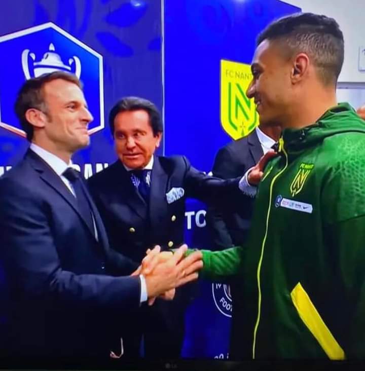 نهائي كأس فرنسا، صافح مصطفي محمد لاعب المنتخب الوطني، مهاجم نانت، الرئيس الفرنسي ايمانويل ماكرون قبل بداية نهائي كأس فرنسا بين نانت وتولوز.
