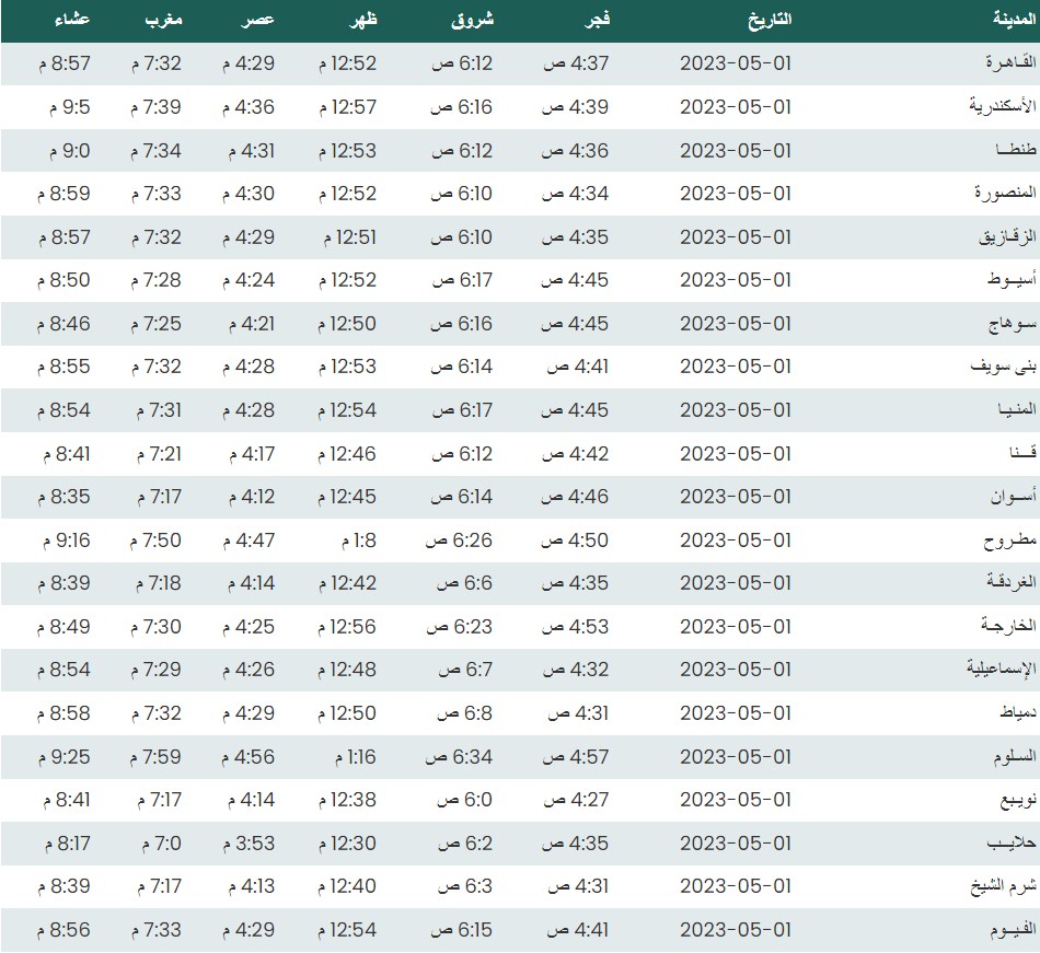 مواقيت الصلاة اليوم الإثنين 1 - 5 - 2023 في القاهرة والمحافظات