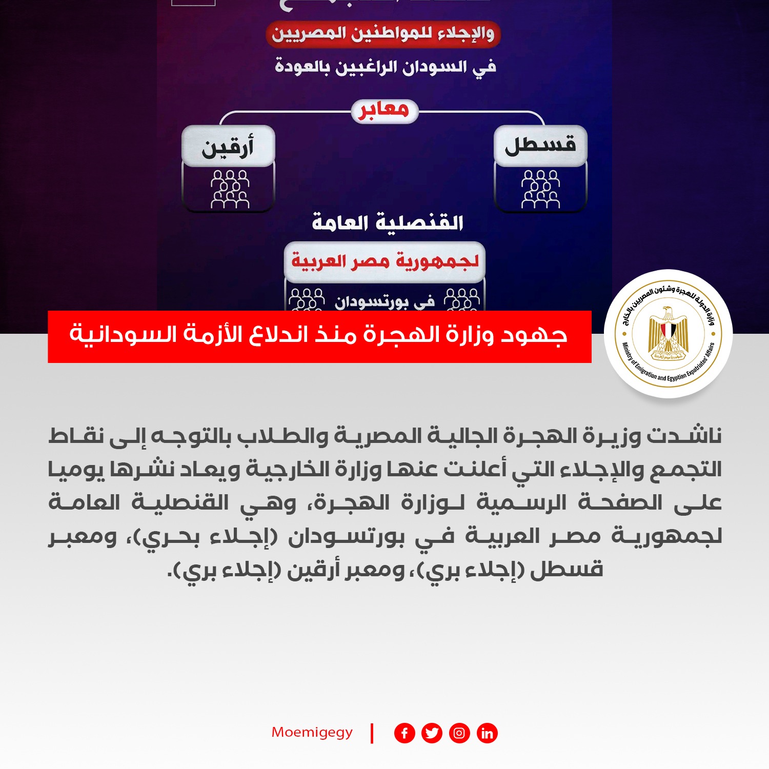 وناشدت وزيرة الهجرة الجالية المصرية والطلاب بالتوجه إلى نقاط التجمع والإجلاء التي أعلنت عنها وزارة الخارجية ويعاد نشرها يوميا على الصفحة الرسمية لوزارة الهجرة، وهي القنصلية العامة لجمهورية مصر العربية في بورتسودان (إجلاء بحري)، ومعبر قسطل (إجلاء بري)، ومعبر أرقين (إجلاء بري).