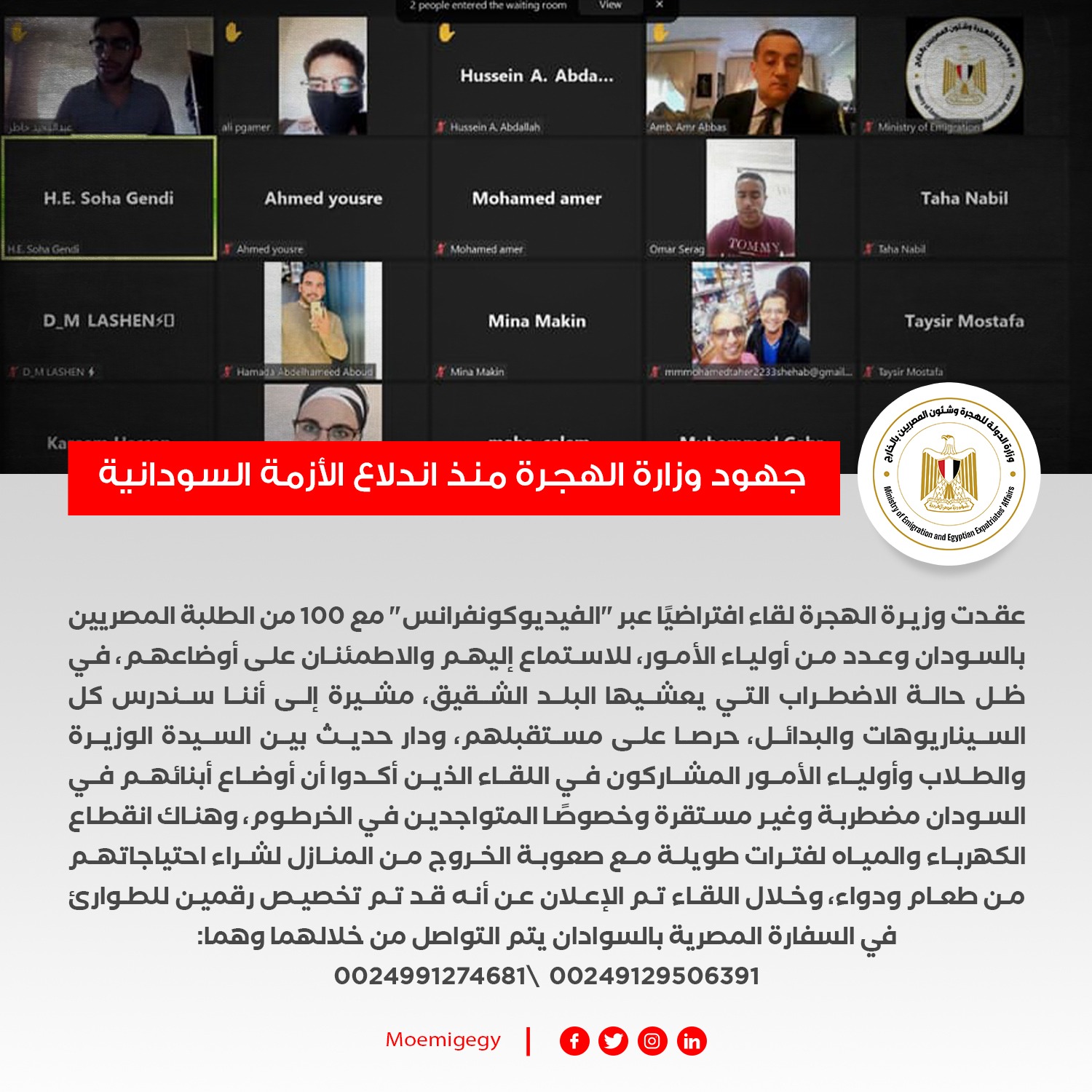 وعقدت وزيرة الهجرة لقاء افتراضيًا عبر "الفيديوكونفرانس" مع ١٠٠ من الطلبة المصريين بالسودان وعدد من أولياء الأمور، للاستماع إليهم والاطمئنان على أوضاعهم، في ظل حالة الاضطراب التي يعشيها البلد الشقيق، مشيرة إلى أننا سندرس كل السيناريوهات والبدائل، حرصا على مستقبلهم، ودار حديث بين السيدة الوزيرة والطلاب وأولياء الأمور المشاركون في اللقاء الذين أكدوا أن أوضاع أبنائهم في السودان مضطربة وغير مستقرة وخصوصًا المتواجدين في الخرطوم، وهناك انقطاع الكهرباء والمياه لفترات طويلة مع صعوبة الخروج من المنازل لشراء احتياجاتهم من طعام ودواء، وخلال اللقاء تم الإعلان عن أنه قد تم تخصيص رقمين للطوارئ في السفارة المصرية بالسوادان يتم التواصل من خلالهما وهما: