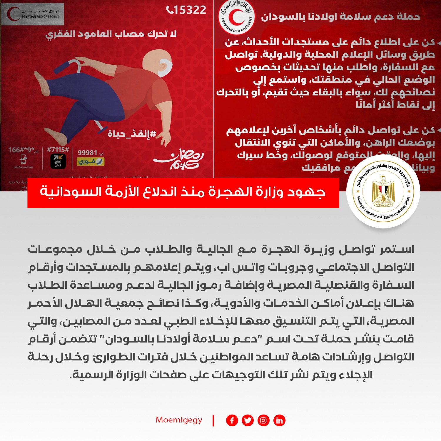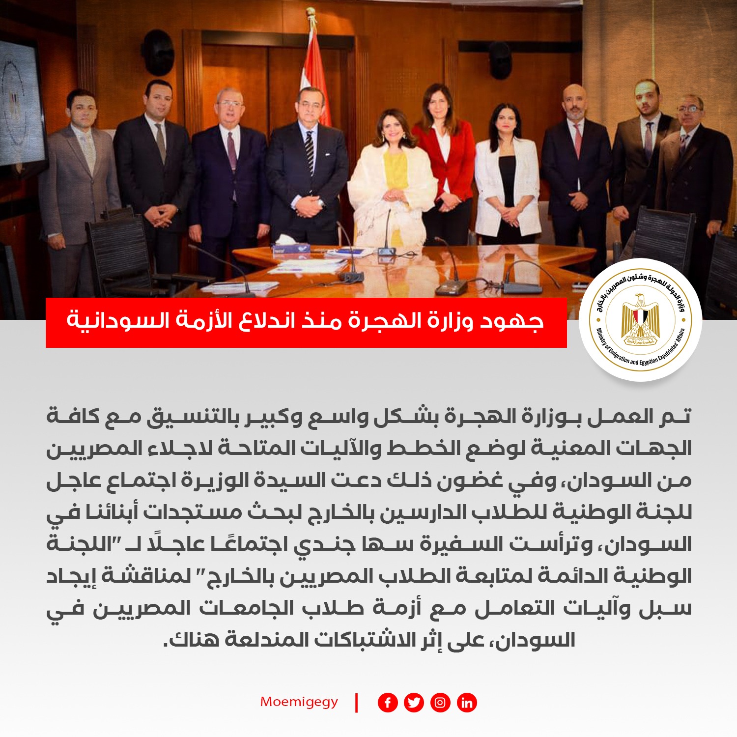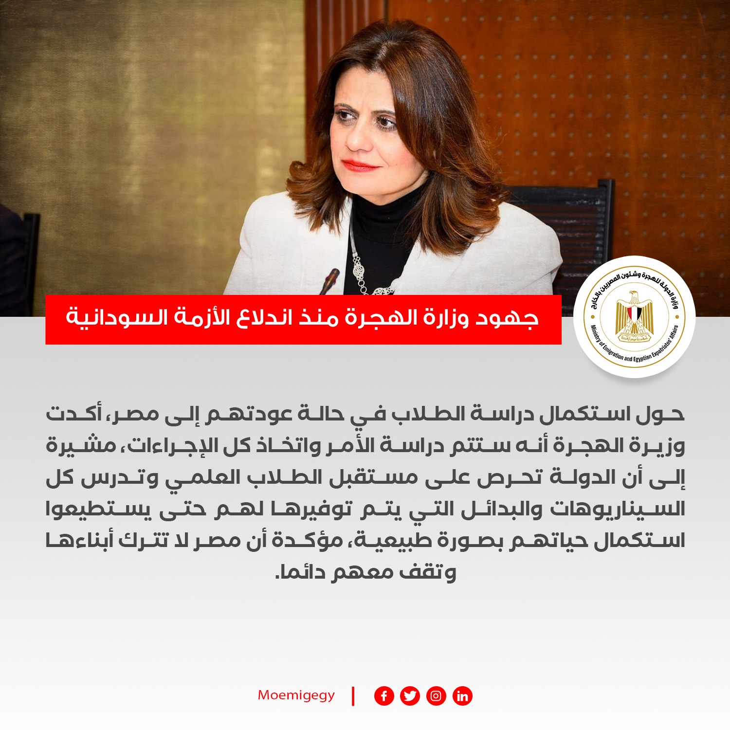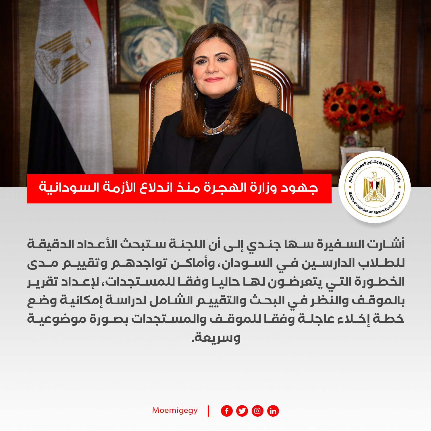 واستمر تواصل وزيرة الهجرة مع الجالية والطلاب من خلال مجموعات التواصل الاجتماعي وجروبات واتس اب، ويتم إعلامهم بالمستجدات وأرقام السفارة والقنصلية المصرية وإضافة رموز الجالية لدعم ومساعدة الطلاب هناك بإعلان أماكن الخدمات والأدوية، وكذا نصائح جمعية الهلال الأحمر المصرية، التي يتم التنسيق معها للإخلاء الطبي لعدد من المصابين، والتي قامت بنشر حملة تحت اسم "دعم سلامة أولادنا بالسودان" تتضمن أرقام التواصل وإرشادات هامة تساعد المواطنين خلال فترات الطوارئ وخلال رحلة الإجلاء ويتم نشر تلك التوجيهات على صفحات الوزارة الرسمية.