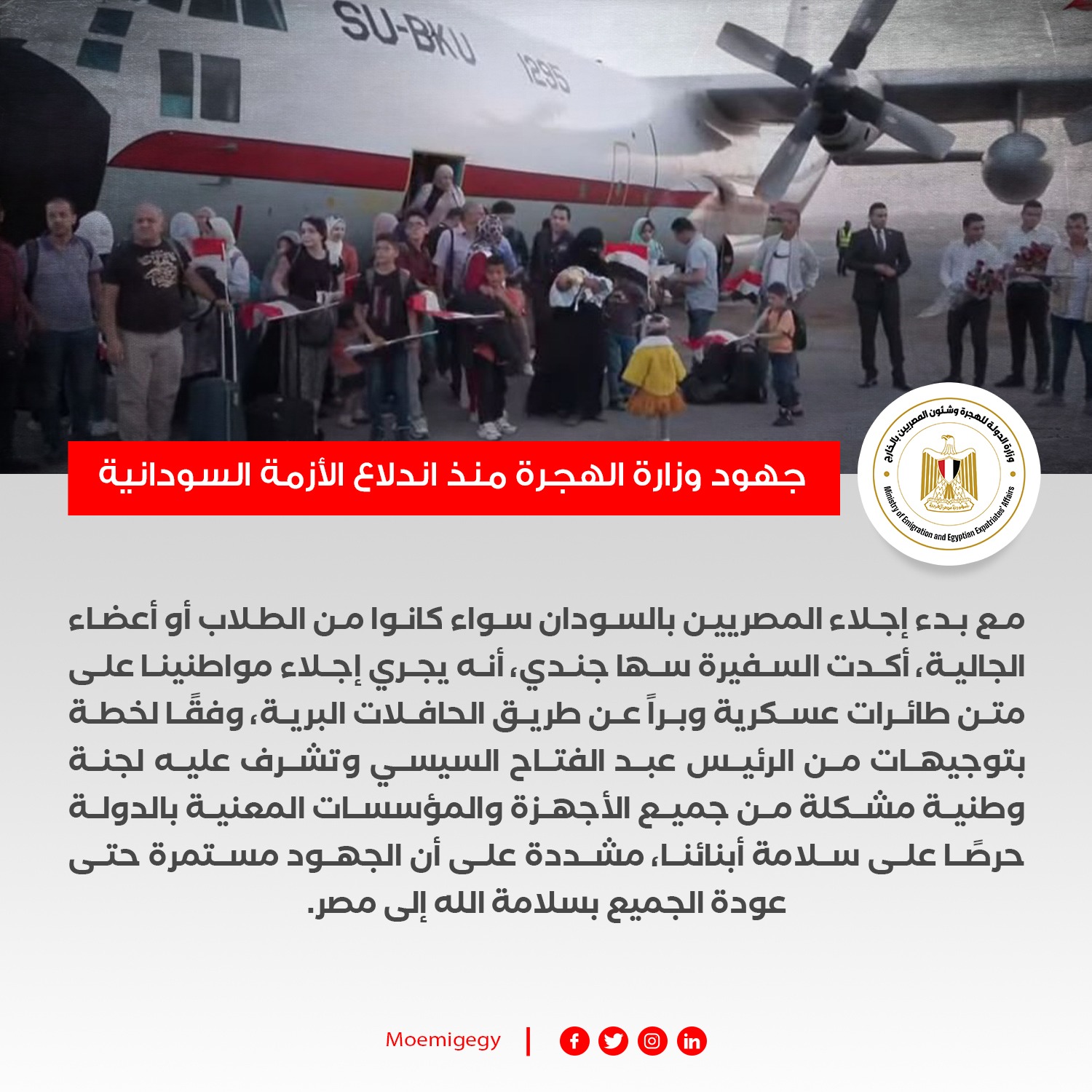 و مع بدء إجلاء المصريين بالسودان سواء كانوا من الطلاب أو أعضاء الجالية، أكدت السفيرة سها جندي، أنه يجري إجلاء مواطنينا على متن طائرات عسكرية وبرًا عن طريق الحافلات البرية، وفقًا لخطة بتوجيهات من الرئيس عبد الفتاح السيسي وتشرف عليه لجنة وطنية مشكلة من جميع الأجهزة والمؤسسات المعنية بالدولة حرصًا على سلامة أبنائنا، مشددة على أن الجهود مستمرة حتى عودة الجميع بسلامة الله إلى مصر.