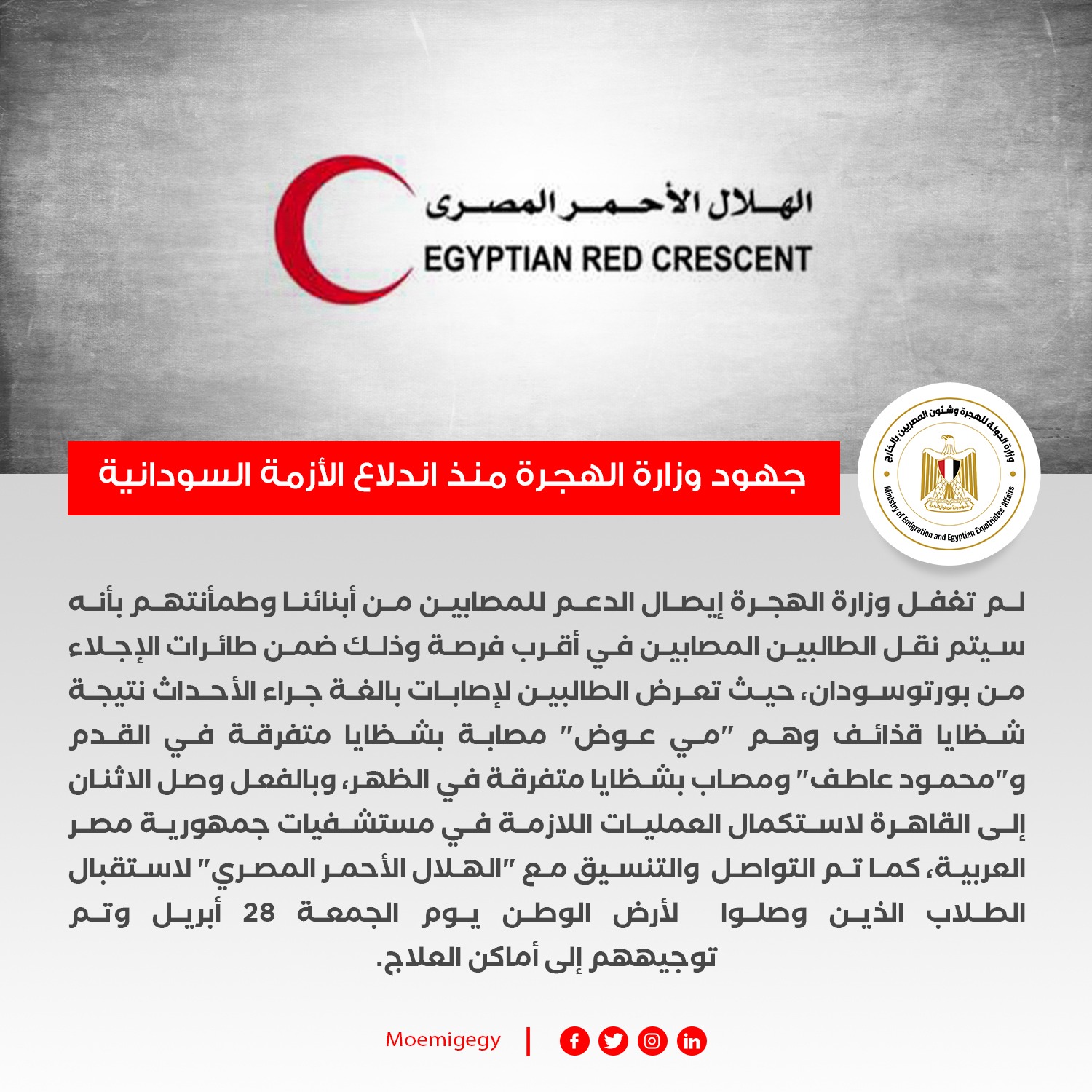 ولم تغفل وزارة الهجرة إيصال الدعم للمصابين من أبنائنا وطمأنتهم بأنه سيتم نقل الطالبين المصابين في أقرب فرصة وذلك ضمن طائرات الإجلاء من بورتوسودان، حيث تعرض الطالبين لإصابات بالغة جراء الأحداث نتيجة شظايا قذائف وهم "مي عوض" مصابة بشظايا متفرقة في القدم و"محمود عاطف" ومصاب بشظايا متفرقة في الظهر، وبالفعل وصل الاثنان إلى القاهرة لاستكمال العمليات اللازمة في مستشفيات جمهورية مصر العربية، كما تم التواصل والتنسيق مع "الهلال الأحمر المصري" لاستقبال الطلاب الذين وصلوا لأرض الوطن يوم الجمعة 28 أبريل وتم توجيههم إلى أماكن العلاج.