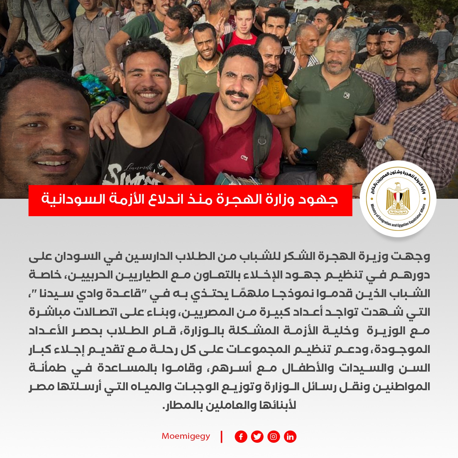 - وجهت وزيرة الهجرة الشكر للشباب من الطلاب الدارسين في السودان على دورهم في تنظيم جهود الإخلاء بالتعاون مع الطيارين الحربيين، خاصة الشباب الذين قدموا نموذجا ملهمًا يحتذي به في "قاعدة وادي سيدنا "، التي شهدت تواجد أعداد كبيرة من المصريين، وبناء على اتصالات مباشرة مع الوزيرة وخلية الأزمة المشكلة بالوزارة، قام الطلاب بحصر الأعداد الموجودة، ودعم تنظيم المجموعات على كل رحلة مع تقديم إجلاء كبار السن والسيدات والأطفال مع أسرهم، وقاموا بالمساعدة في طمأنة المواطنين ونقل رسائل الوزارة وتوزيع الوجبات والمياه التي أرسلتها مصر لأبنائها والعاملين بالمطار.