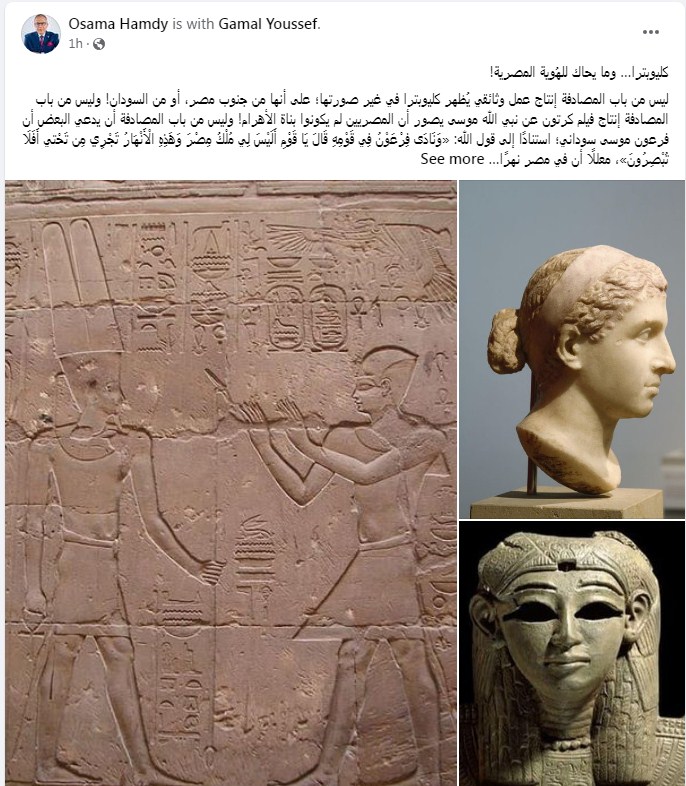 وقال الدكتور أسامة حمدي عن تشويه كليوباترا: "كليوباترا… وما يحاك للهُوية المصرية! ليس من باب المصادفة إنتاج عمل وثائقي يُظهر كليوباترا في غير صورتها؛ على أنها من السودان"
