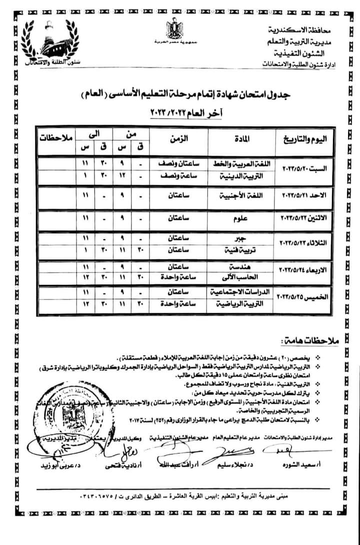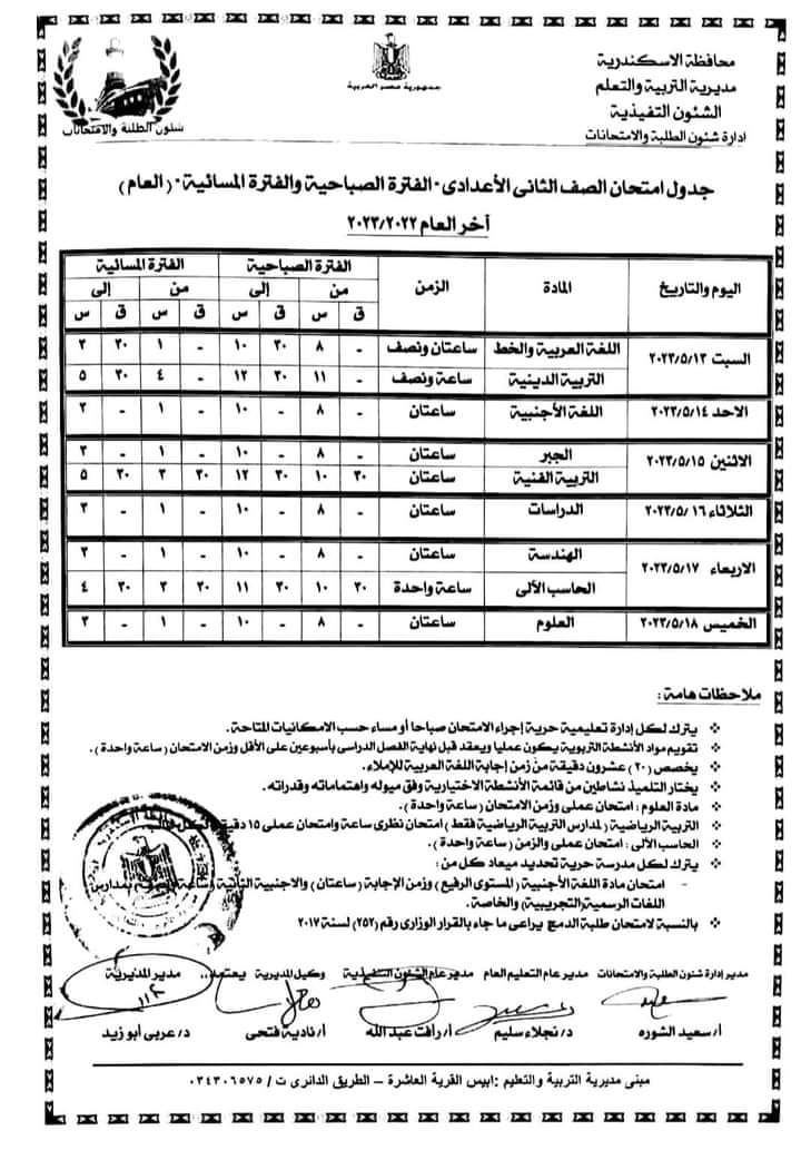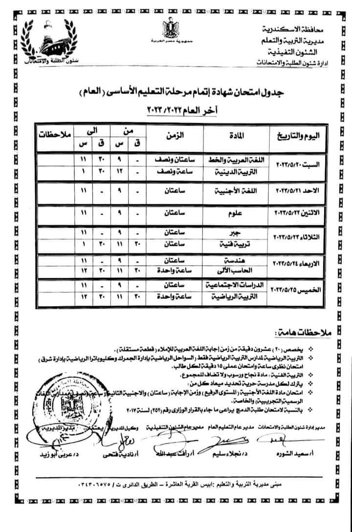 جداول امتحانات الشهادة الإعدادية بمحافظة الإسكندرية