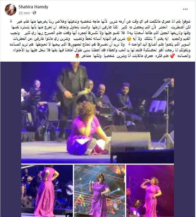 ونشرت شهيرة صورا لشيرين عبد الوهاب من الحفل، وعلقت عليها قائلة: "شوفوا بقي أنا عمري ما اتكلمت في أي وقت عن أزمة شيرين لأنها حاجة شخصية وندعيلها وخلاص ربنا يخرجها منها على خير".