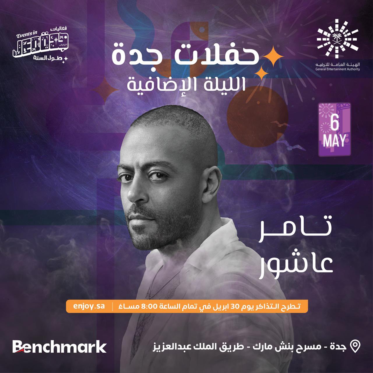 روج الفنان تامر عاشور لحفله الثاني في جدة بالمملكة العربية السعودية، مشيرا إلى مفاجأة تنتظر جمهوره.