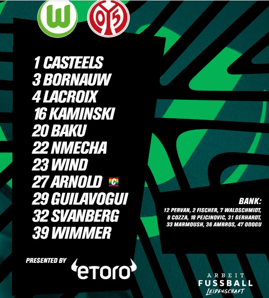 وكان نيكو كوفاتش، المدير الفني لفريق فولفسبورج أعلن تشكيل فريقه لمباراة نادي ماينز، في اللقاء الذي يجمع بينهما ضمن منافسات بطولة الدوري الألماني.