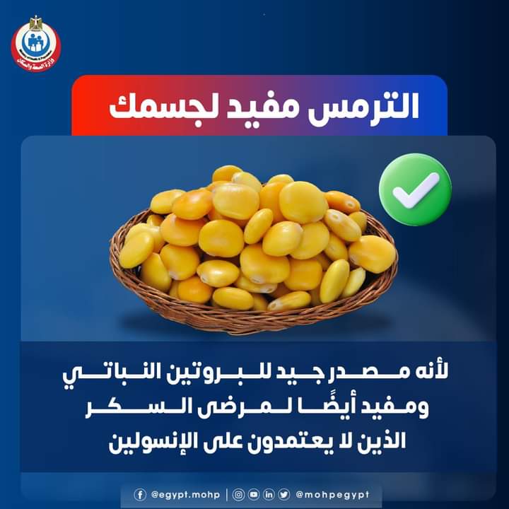 نصحت وزارة الصحة بأهمية تناول الترمس لما له من فوائد للجسم، لأنه مصدر جيد للبروتين النباتي.