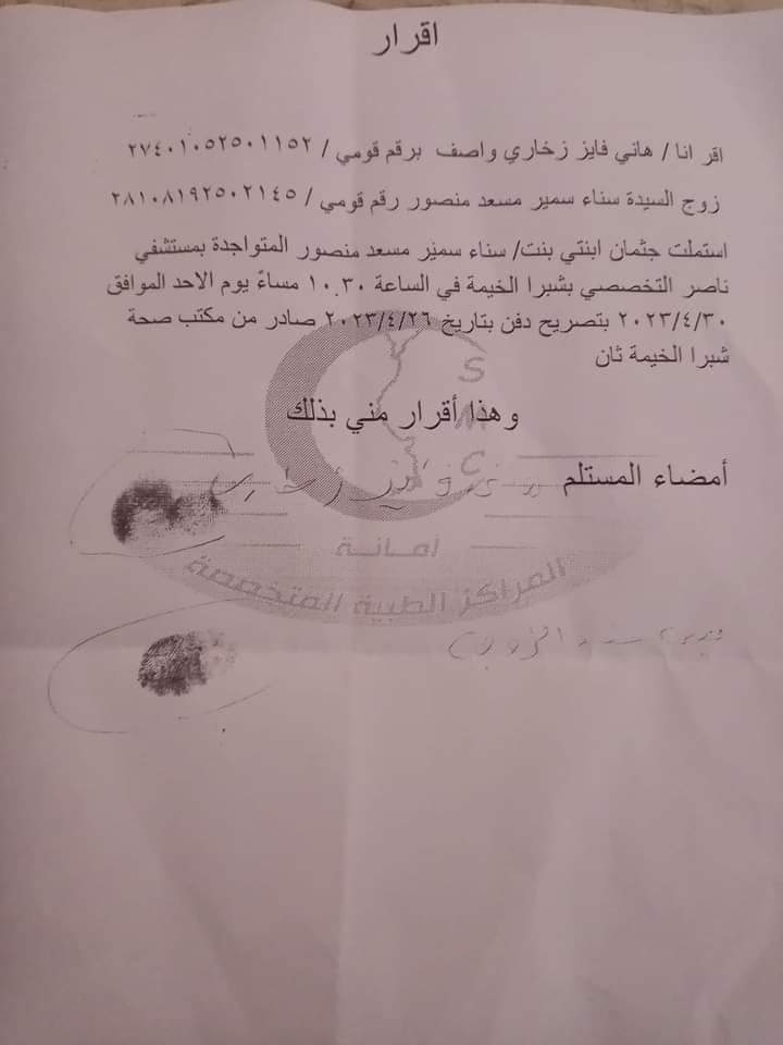 أما هاني فايز زغاري والد الطفلة، فتوجه بالشكر إلى الجهات المعنية للاستجابة وتسليمه جثة الطفلة لدفنها، مقرا بالاستلام، كما جاء في تصريح الدفن الذي حصلت “فيتو” على نسخة منه.