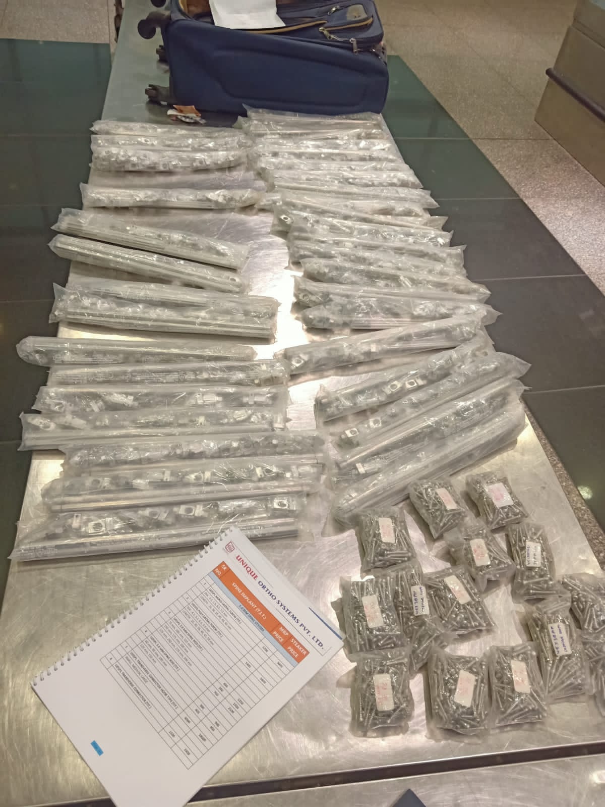 وقام تامر عادل أحمد مدير الحركة المشرف على صالة الوصول بمبني الركاب رقم ٢، بتكليف احمد محمد عبد السلام مأمور الجمرك، بتفتيش حقائب الراكب يدويا مما اسفر عن وجود كمية كبيرة من المسامير المعدنية، حاول الراكب خداع رجال الجمارك بادعاء انها قطع غيار خاصة بالتوكتوك، الا انه تلاحظ لمامور الجمرك وجود "كتالوجات" خاصة بمستلزمات طب العظام من مسامير ووحدات تثبيت.